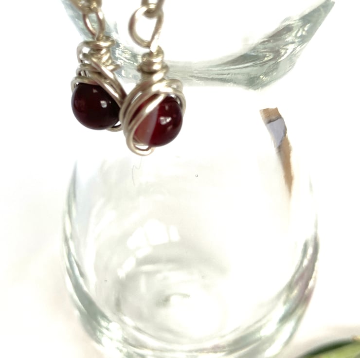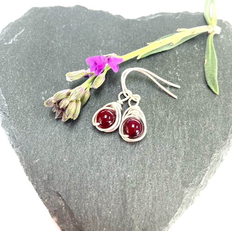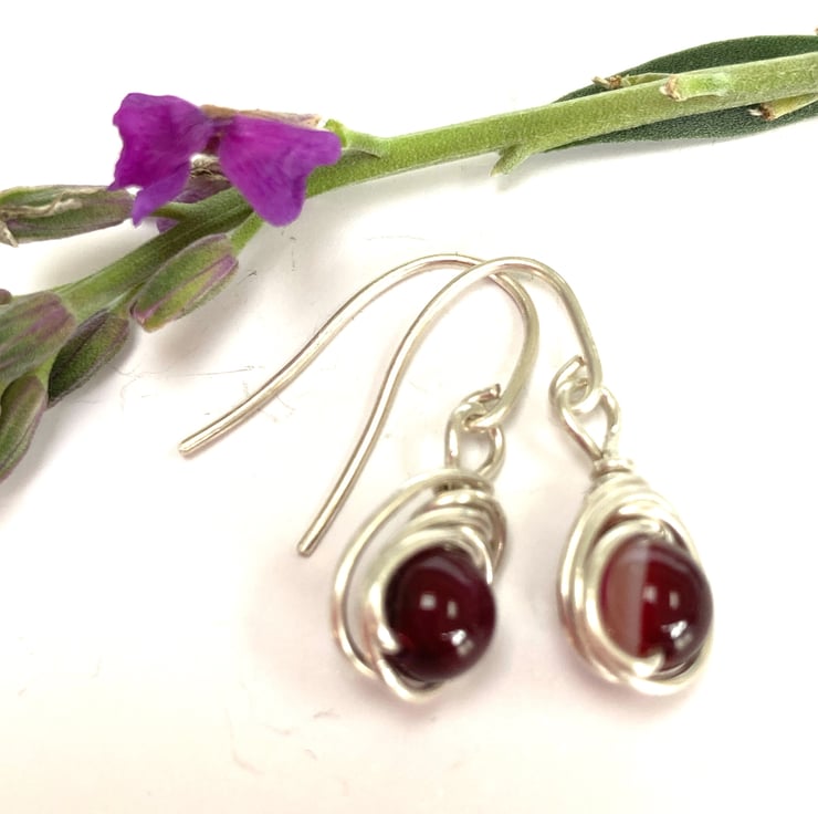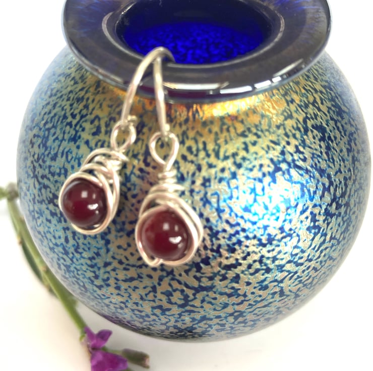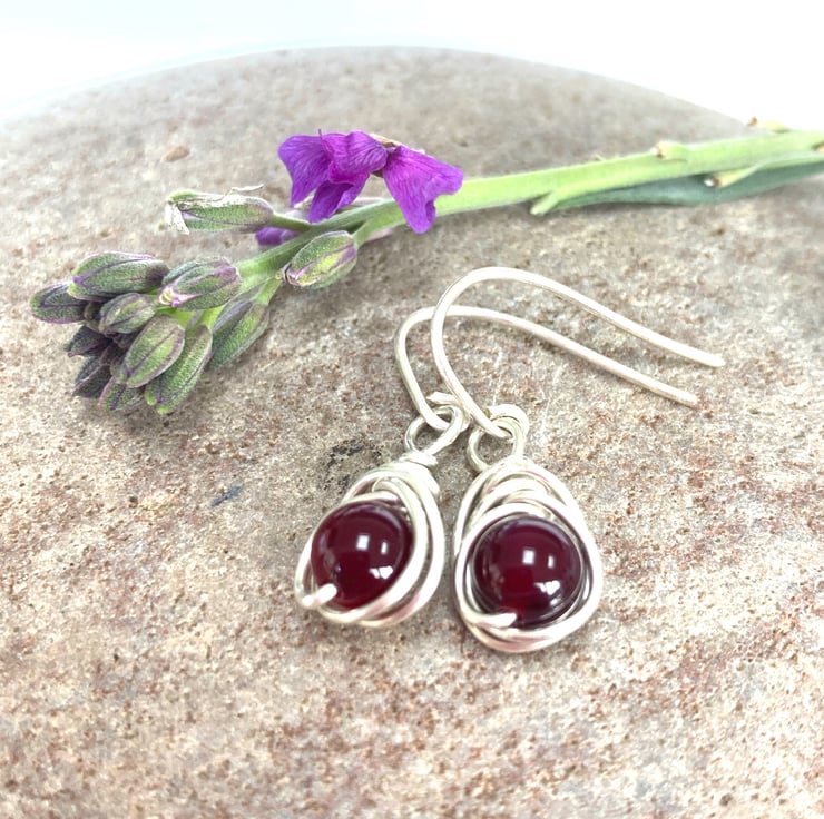 These pretty earrings have been created from sterling silver wire, using a herringbone wire wrapping technique and deep pink agate gemstone beads. They have hand crafted sterling silver fittings.