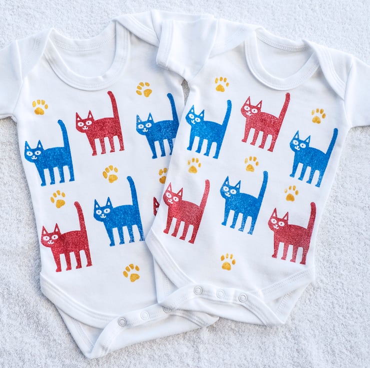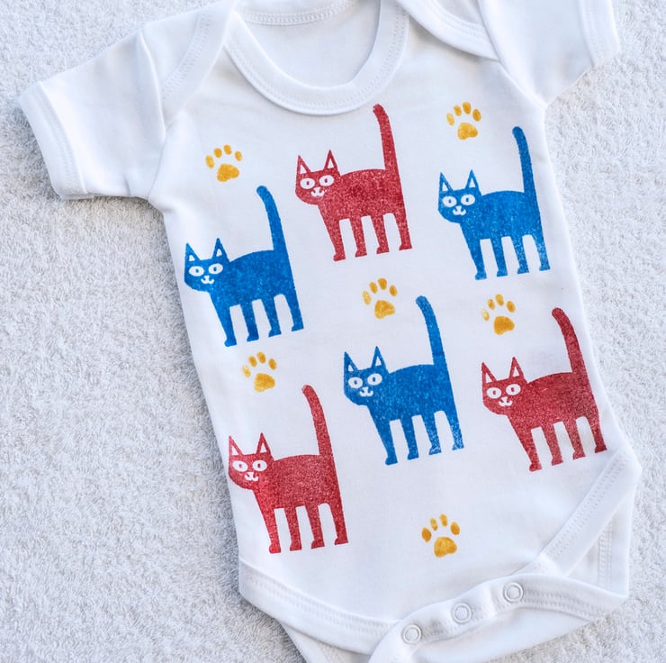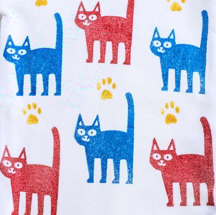 Please note: Due to the hand printed nature of these products, there will be variations in the colour density and textural appearance between each cat and between each babygro. These differences are part of the charm of a hand printed product and should not be seen as 'faults'.