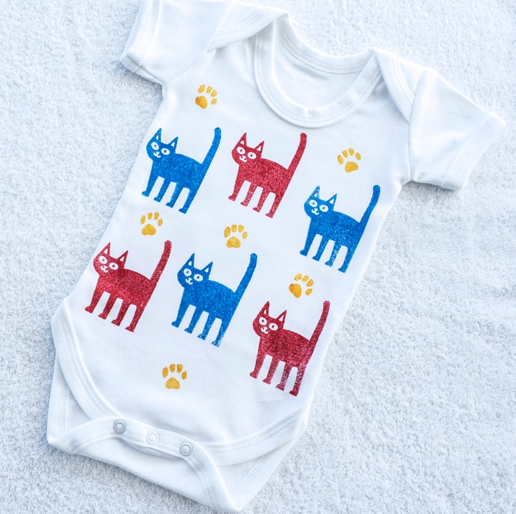 It is many years since I had my baby, but she has always grown up with cats in the house. Now her friends are having babies and many of them have cats as well. This made me think that a babygro with cats on would be the perfect baby shower present for them! And one day, I may even print one for my own grandchild!