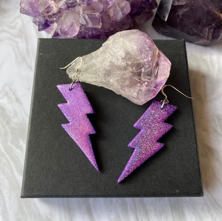These would make an ideal gift for someone who loves sparkly dangle statement earrings especially purple sparkly glitter earrings. This listing is for the purple lightning bolt earrings only. Other colours are available. Current making time 10 - 14 working days from time of ordering. This listing is for the lightning bolt earrings only.