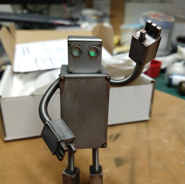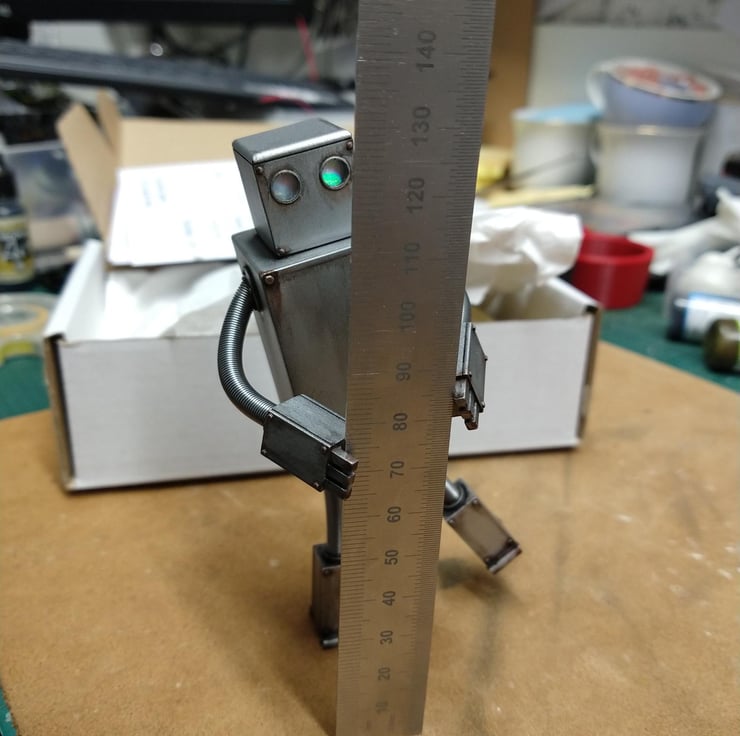 He is a little model kit of a robot my son designed and I made, after he was inspired by the book the Iron Man. He stands about 120mm tall. He is semi poseable, as my son wanted him to be 'bendable'?! So his arms and legs can be bent because of the armature wire and springs that make up his limbs.