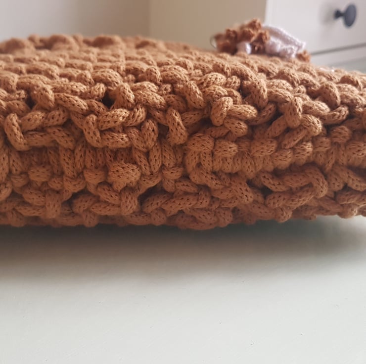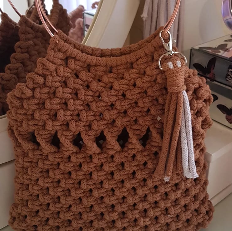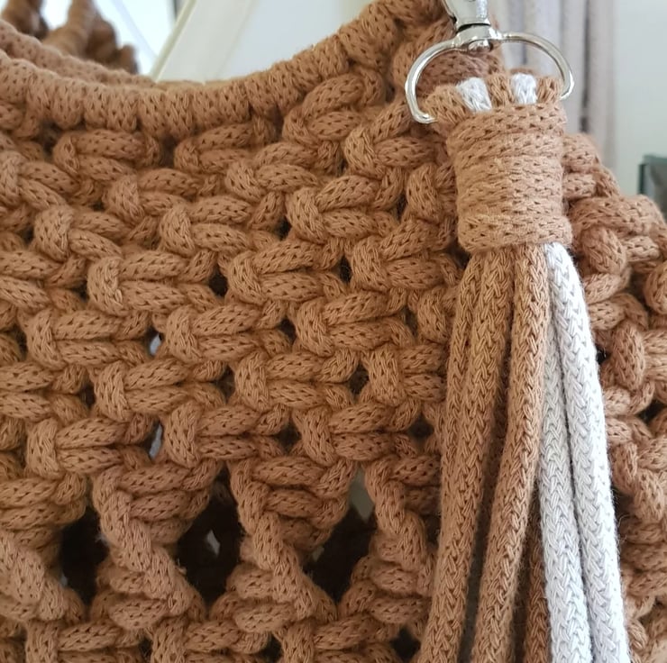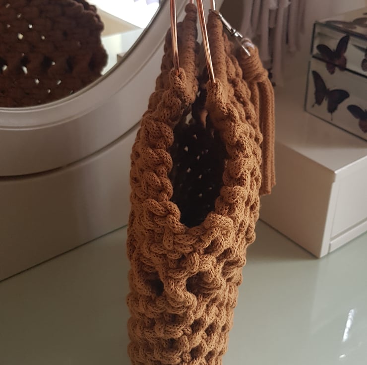 I made this top handle macrame bag using Bobbiny braided cotton cord in caramel. The handles are rose gold coloured metal rings which are rust proof and strong. They compliment the caramel colour beautifully.