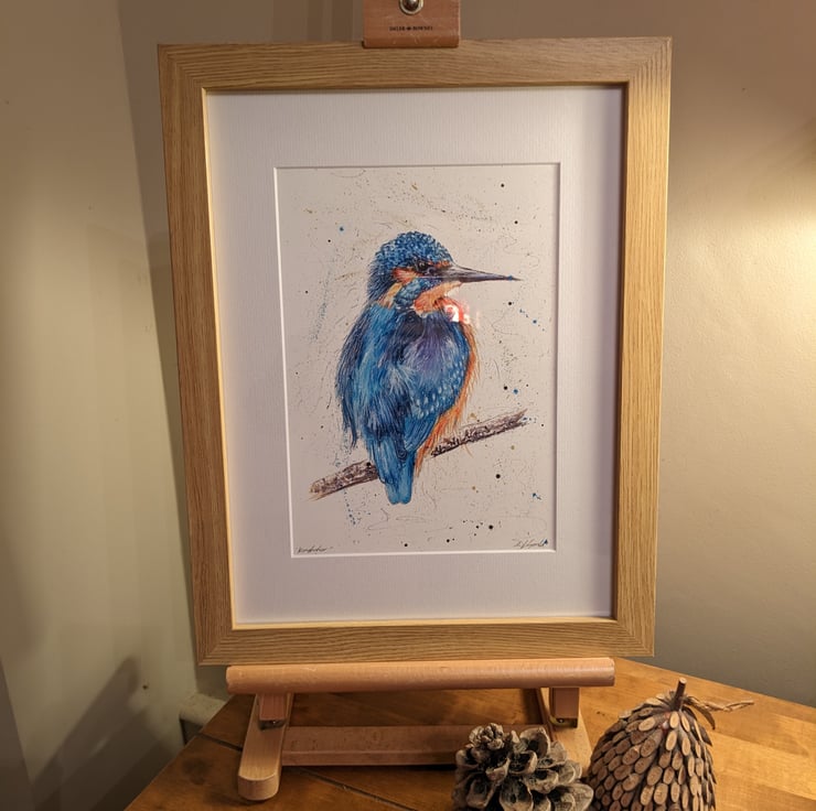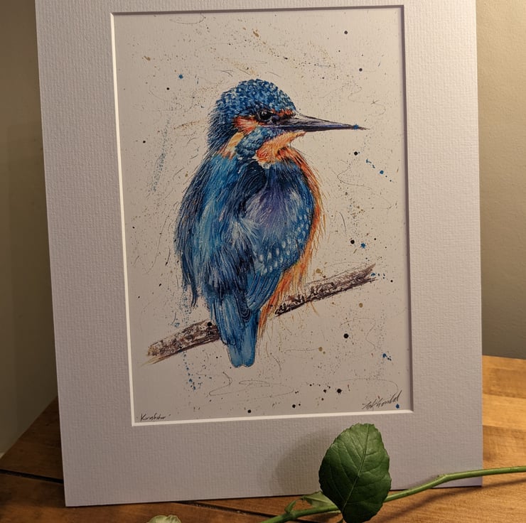 An open edition signed high quality print of an original painting of a Kingfisher. The original painting is mixed media. I used watercolours, polychromos artists colouring pencils and drawing inks. Each print is professionally mounted with a textured white mount and is cellophane wrapped.
