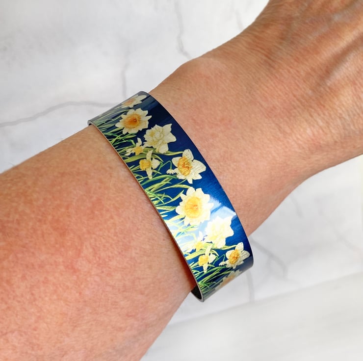 Handmade cuff bracelet with daffodil flowers, which has a dark blue background with pretty yellow daffodil flowers, hand drawn design. The back has a yellow pattern. Matching pendant and earrings are available. An inscription can be added to the reverse for a small extra charge. (Optional)