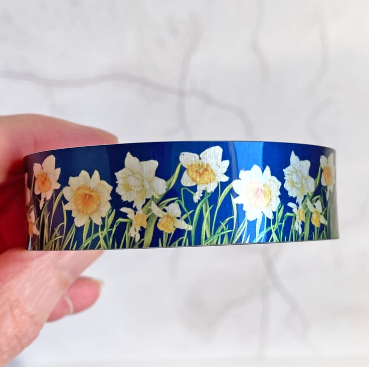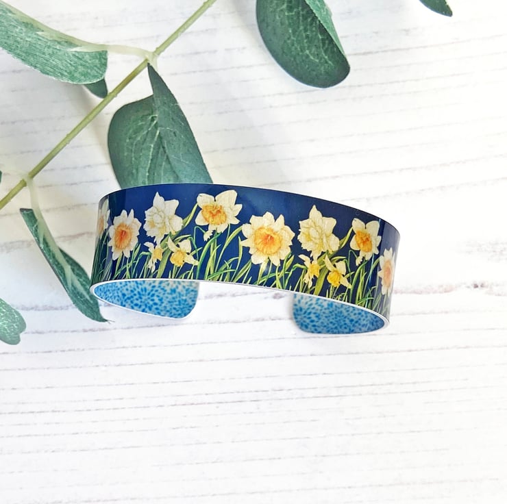 Handmade cuff bracelet with daffodil flowers, which has a dark blue background with pretty yellow daffodil flowers, hand drawn design. The back has a yellow pattern. Matching pendant and earrings are available. An inscription can be added to the reverse for a small extra charge. (Optional)