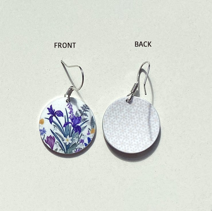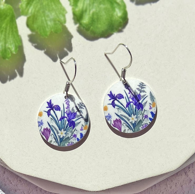 I have handmade the discs and artwork for these earrings, and the drops have a pretty iris spring flower design, An ideal gift for nature lovers. Matching bracelet and pendant available.