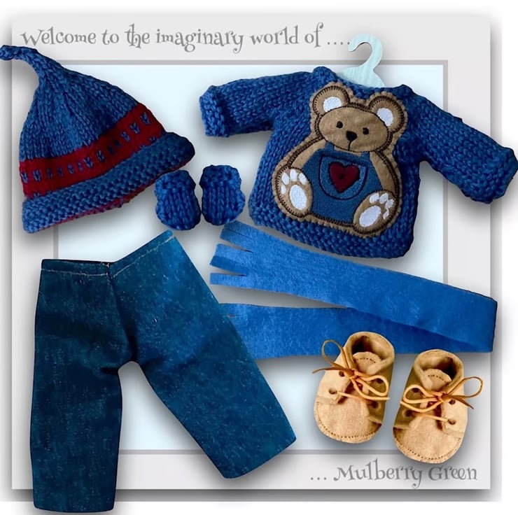 A cute denim blue jumper, embroidered with a teddy bear, to fit the Mulberry Green characters. The jumper is hand knitted and looks lovely with the jeans or corduroy trousers in my shop.