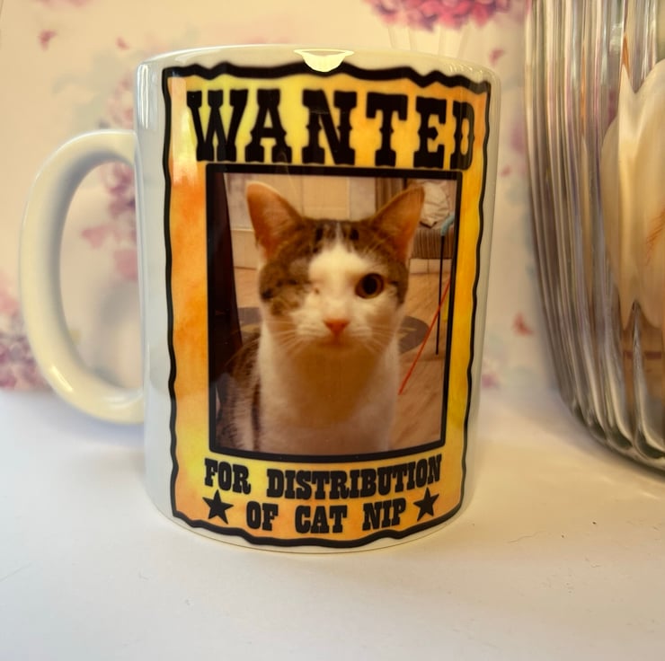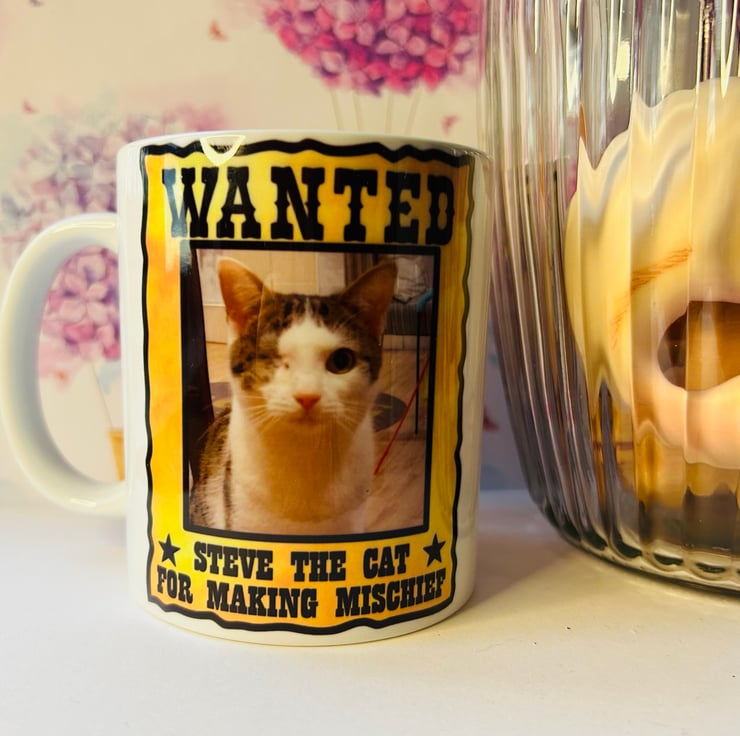 Personalise your own mug with your very own cat on a wanted poster.