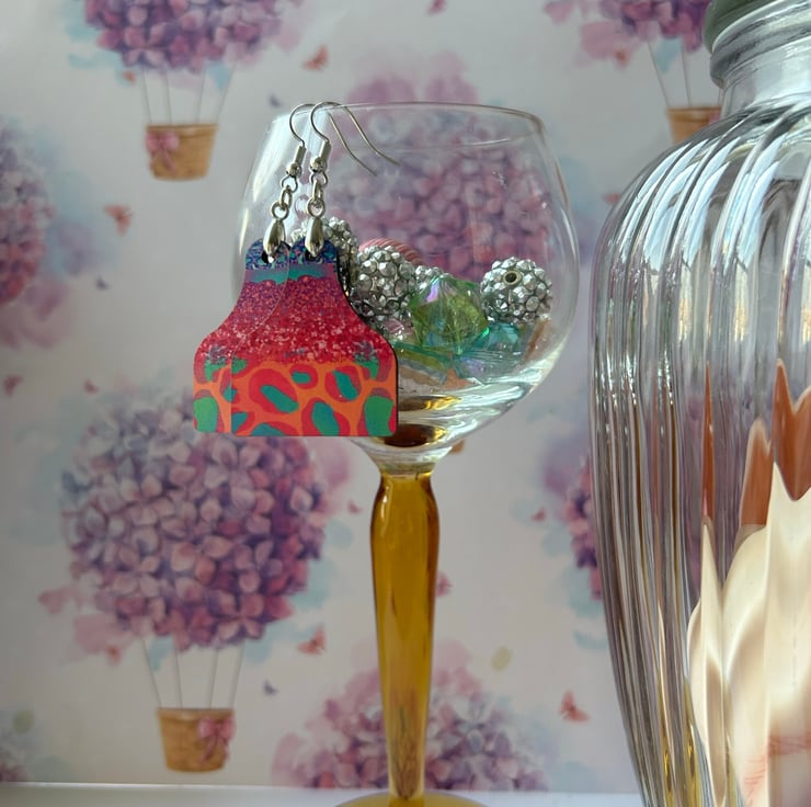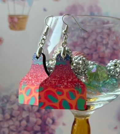 Hand printed cow tag shaped MDF earrings with orange and green/blue animal print and glitter print design.