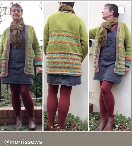 A play with variegated yarn, this cardigan displays what can be achieved when yarns are swapped or rows are shortened and the same mosaic slip stitch pattern is used. Variegated yarn and a plain solid yarn are used together, to give a bold look to this simply shaped, casual cardigan.