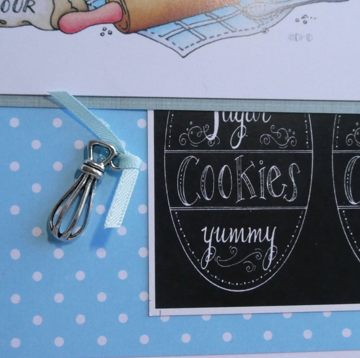 The background card is bright blue with white polka dots and the card has been finished with a tiny silver metal whisk, tied with an aquamarine ribbon.