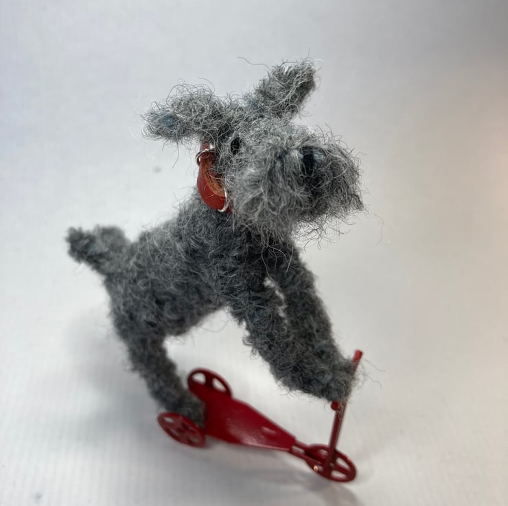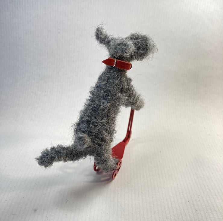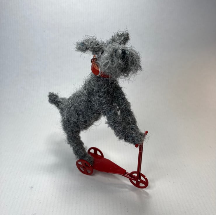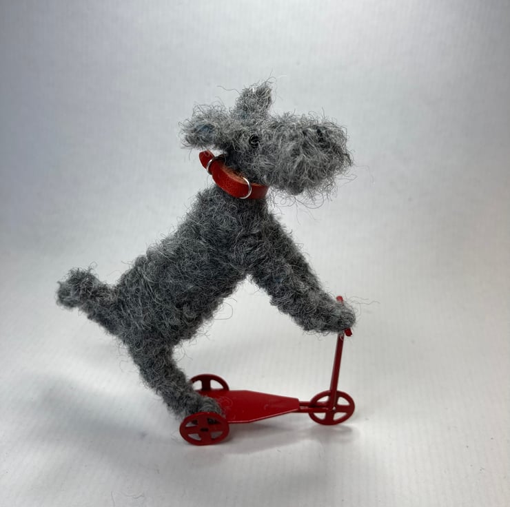OOAK sculptured miniature dog on mini metal scooter. Fudge stands 10cm tall by 8.5cm in length. All my animals are hand finished with eyes and noses and, if needed, wool whiskers! Fudge has a handmade red leather collar.