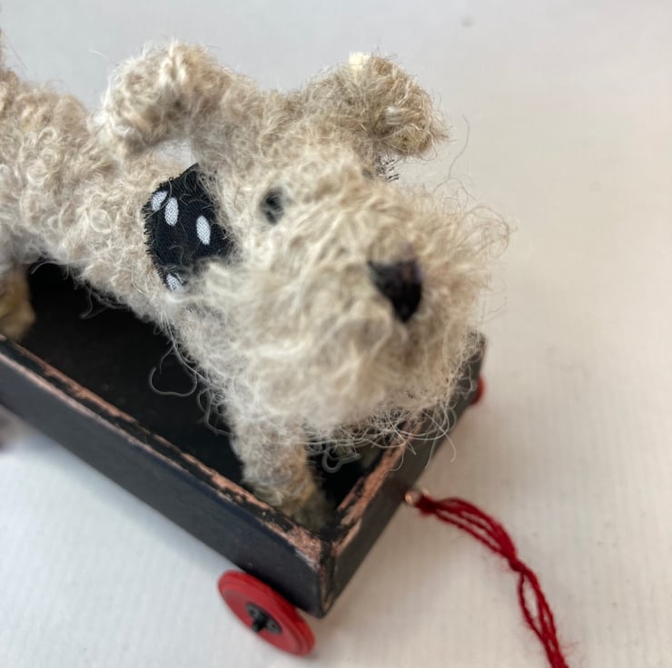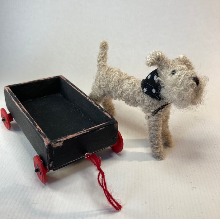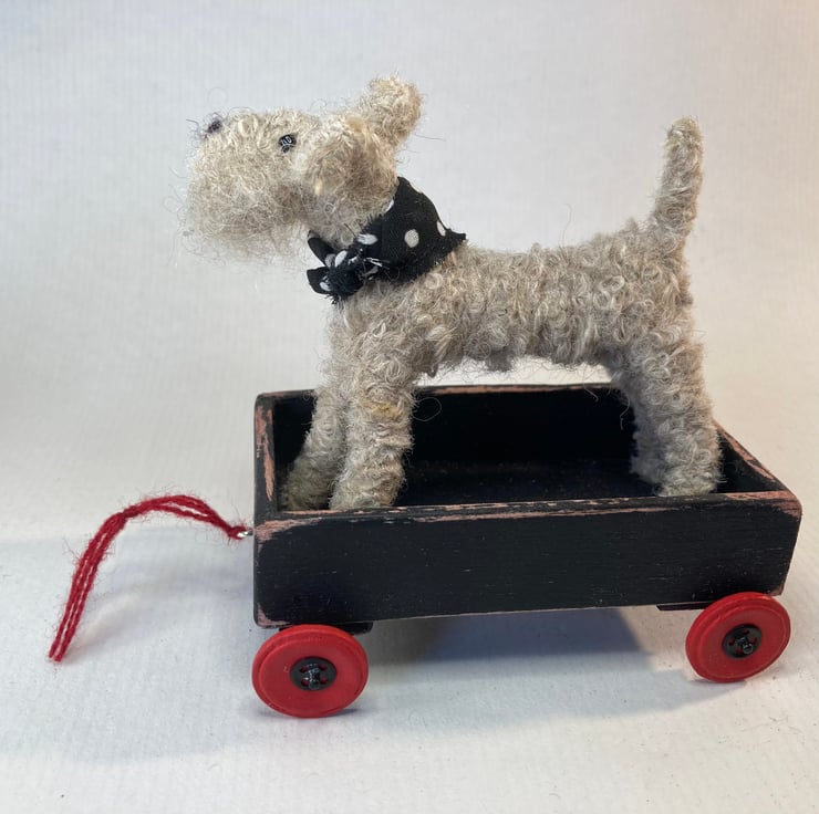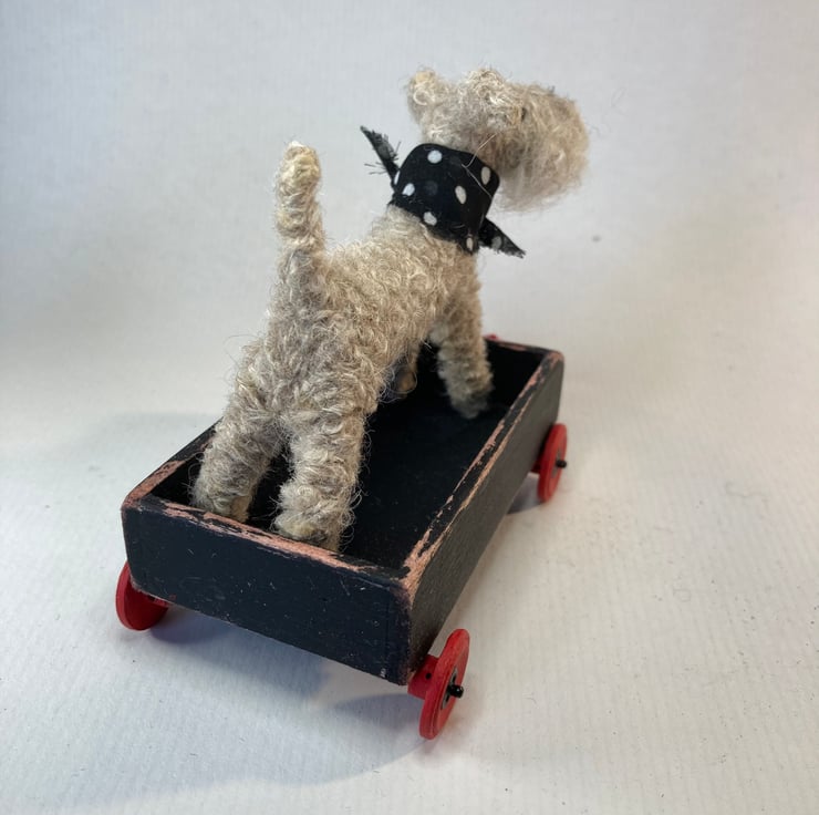 OOAK sculptured miniature terrier with a handmade wooden trolley with wheels.