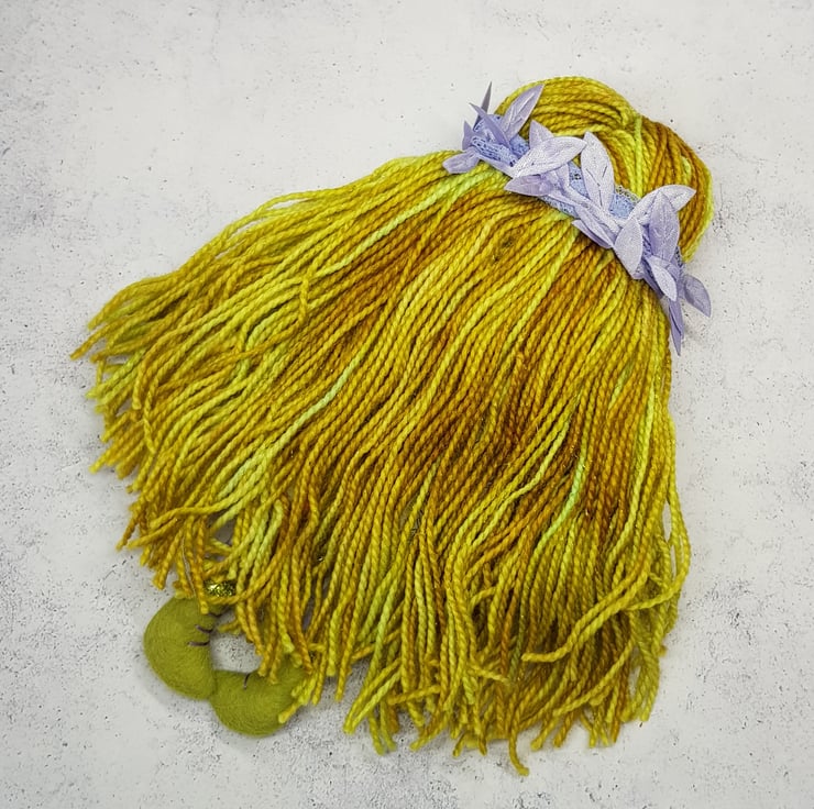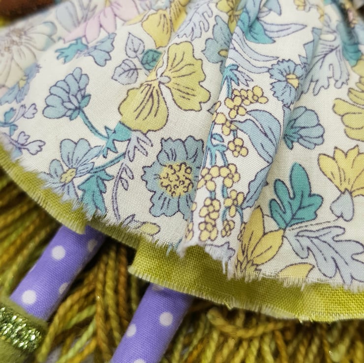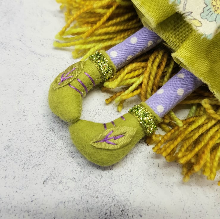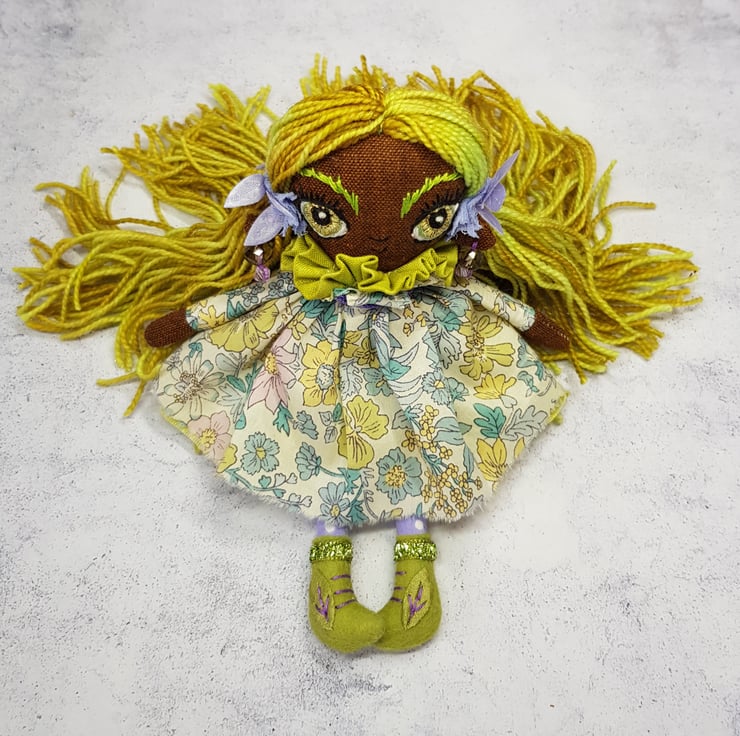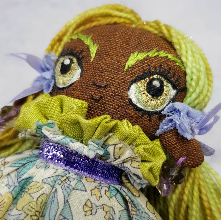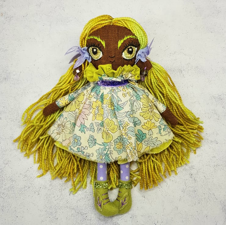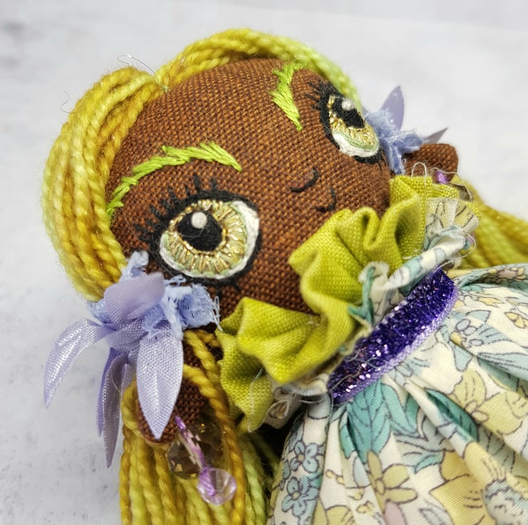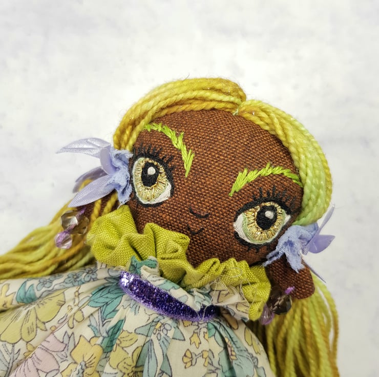 Beautifully hand stitched art doll with liberty of london print dress. Meadow has hand spun yarn hair sewn into place decorated with lace and leaf trim. Meadow wears felt boots that are decorated with hand sewn laces, sparkly trim and green leaf. Meadow has a green under skirt and sparkly neck trim, she wears upcycled bead earings and her face is lovingly hand embroidered. This doll measures roughly 17.5cm tall and a one of a kind are doll for decorative purposes. This is not a toy.