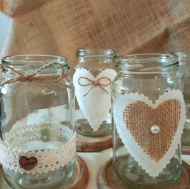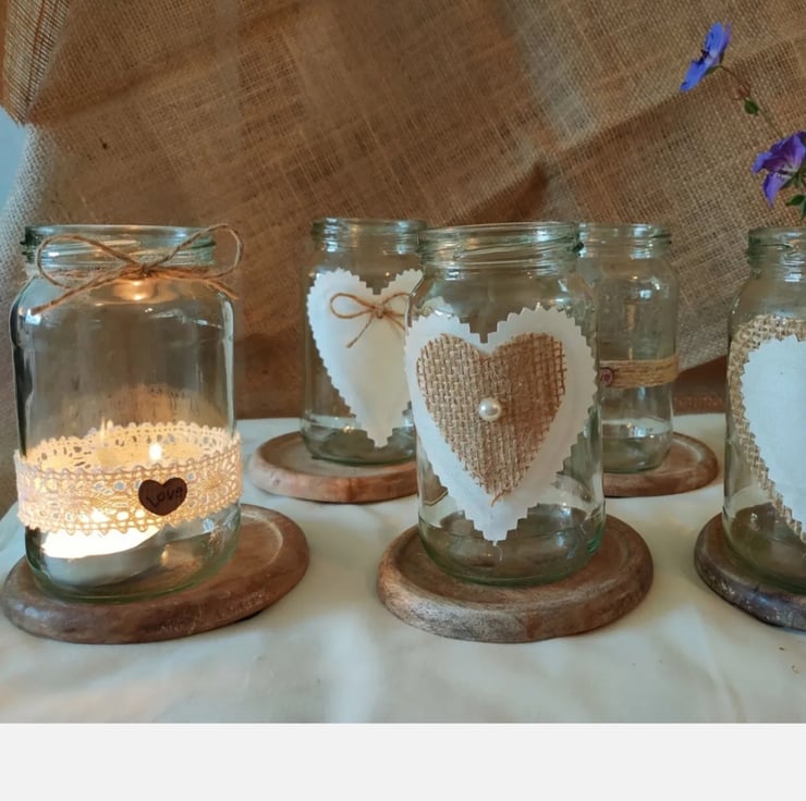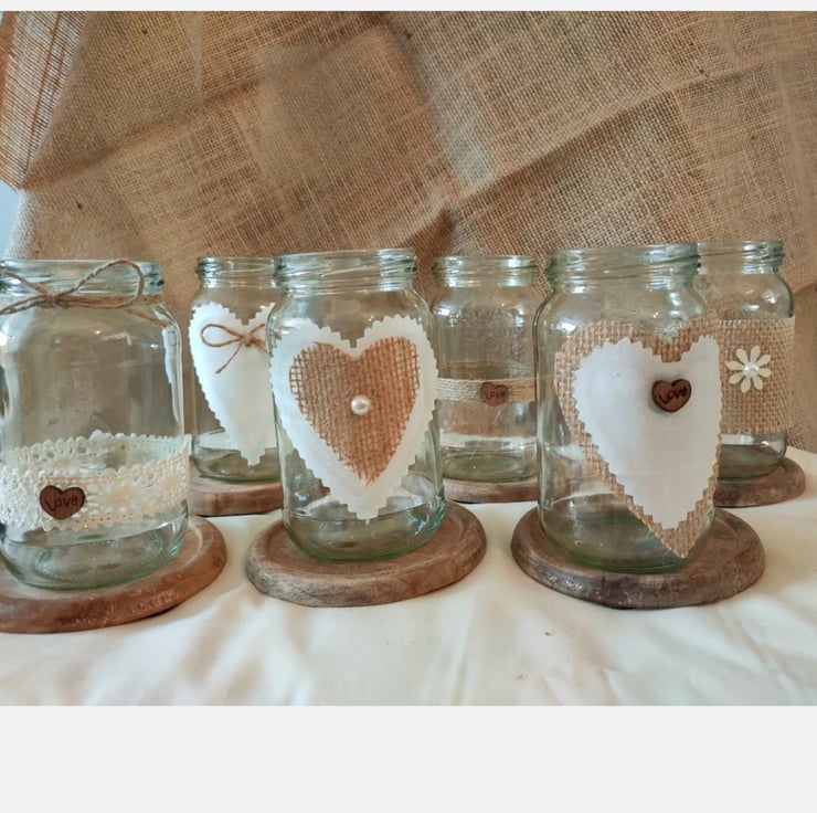 This is a set of 6 new jars all hand decorated in a rustic vintage style ideal for flowers or tealights wired led lights .