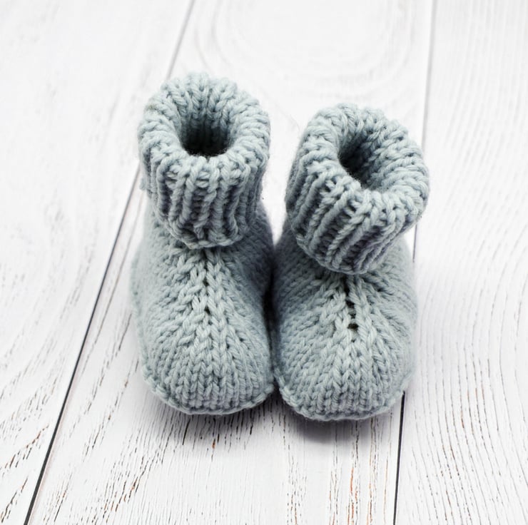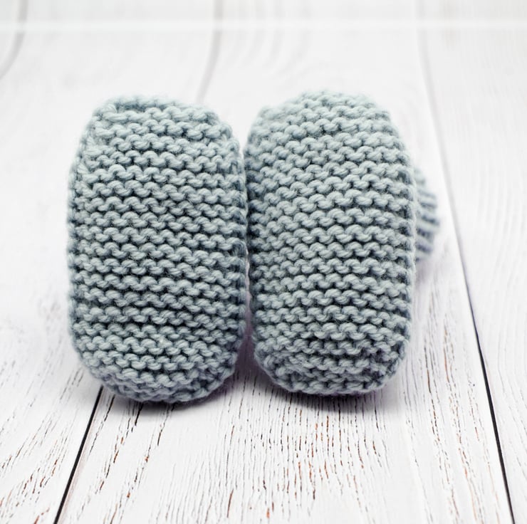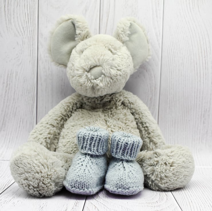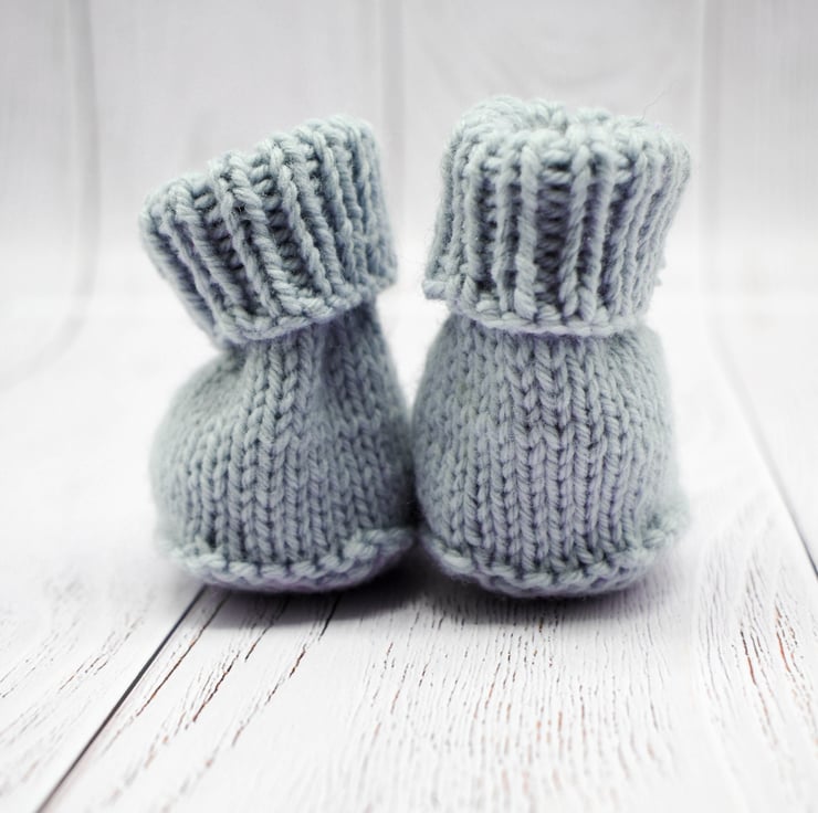Hand knitted with luxuriously soft acrylic blend yarn, these booties will keep little feet lovely and cosy. They are kitted in pastel blue with ribbed cuffs which fold down and also help keep them in place.