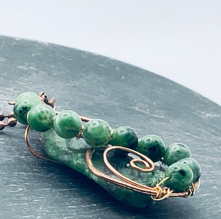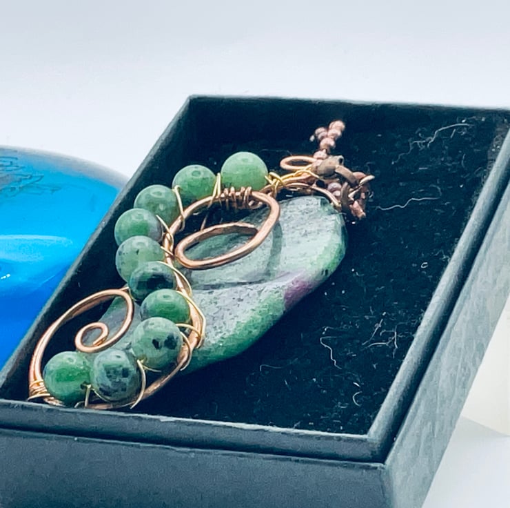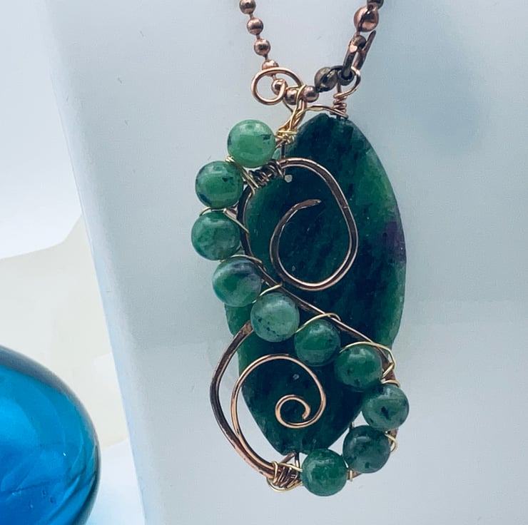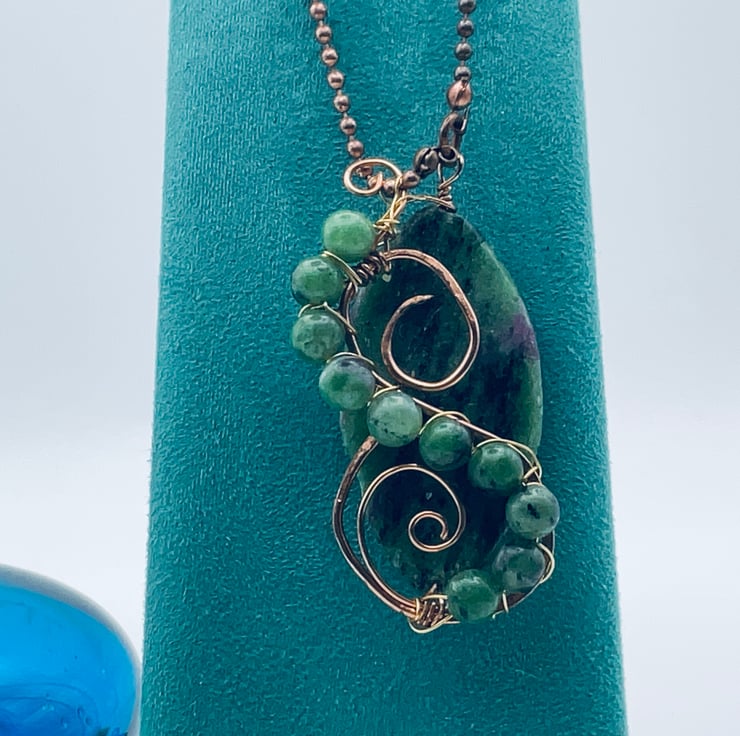 Looking for a gift that is special yet best suited for daywear? This stone looks a little rough and ready, yet it is a sought after gemstone. Soo if this description suits the person you have in mind, look no further, buy it now! It is a ruby with zoisite gemstone adorned with a single S shaped copper swirl adorned with beads of the same stone on a long copper bobble chain.