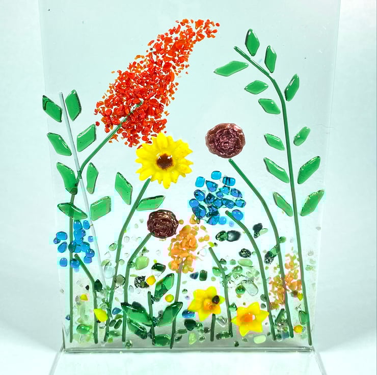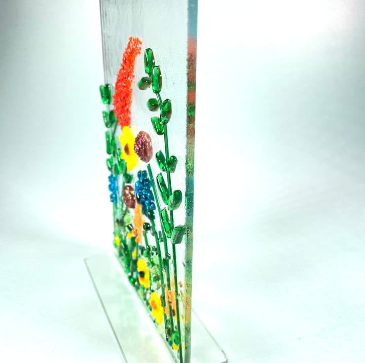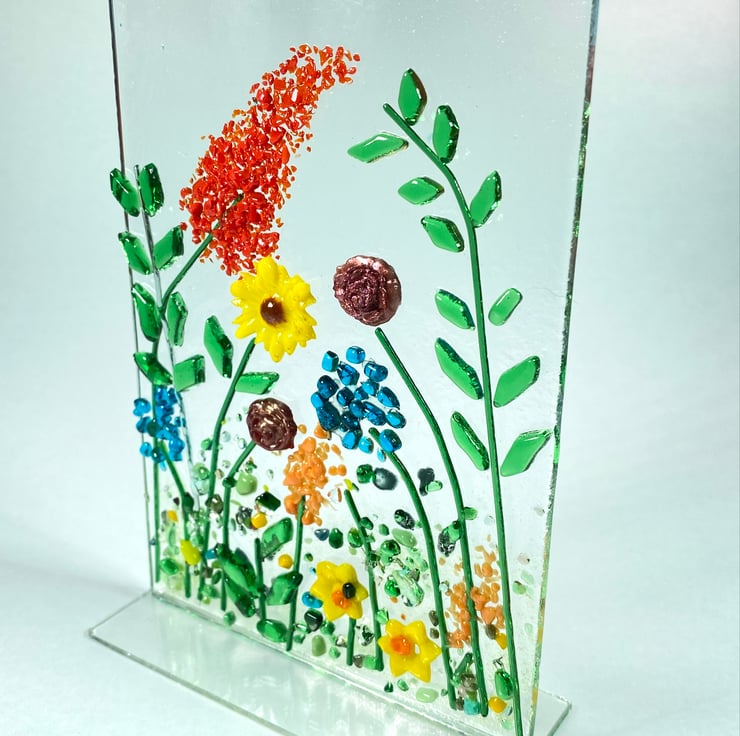 Free standing ornament - based on the gorgeous summery colours of a summer meadow . The fused glass stand up panel sits independently on a glass base and is best placed anywhere it will catch the sun . . The flowers are all created from hand cutting glass and fusing in a kiln for 24 hours . . A lovely glass ornament for your home or for gifting