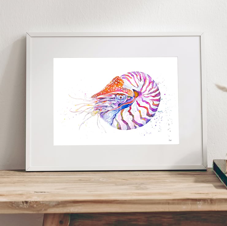 A beautiful fine art Giclee print of the painting 'Chambered Nautilus' by UK artist Jen Lewis. Produced using museum quality inks on professional art paper.