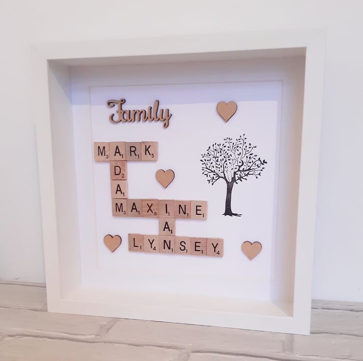 Embellished with wooden hearts, a wooden 'family' sign and a hand stamped tree