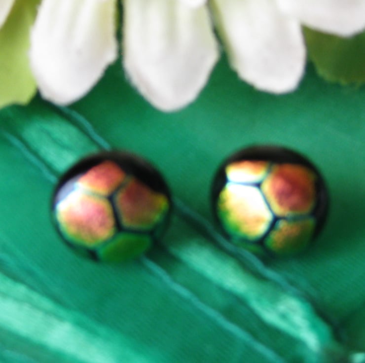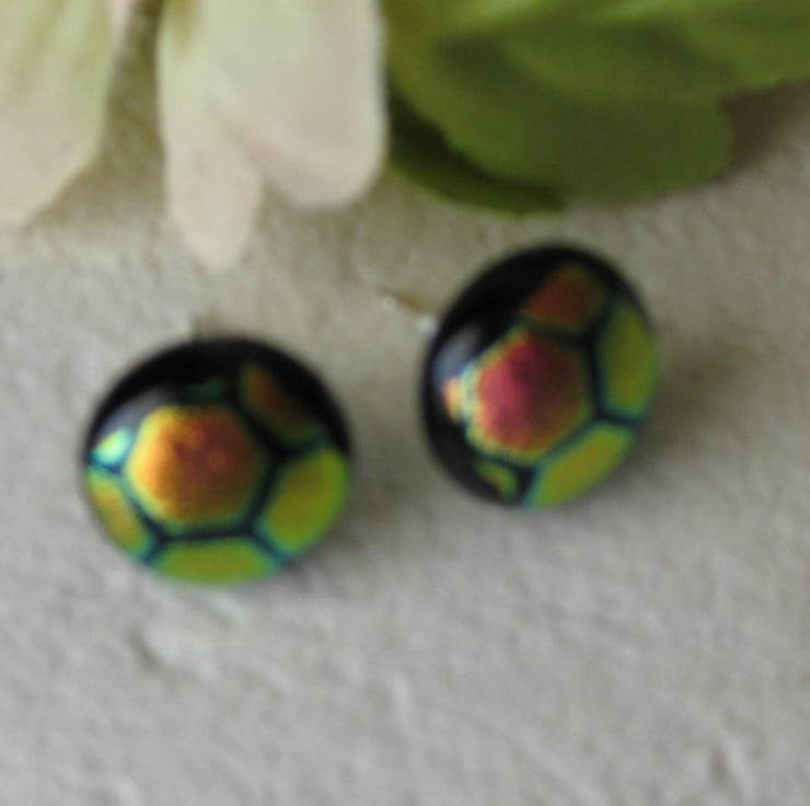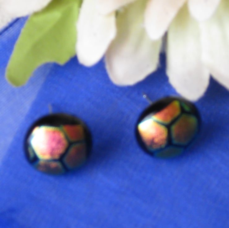 A pair of kiln fused dichroic glass earring studs with a large honeycomb pattern.