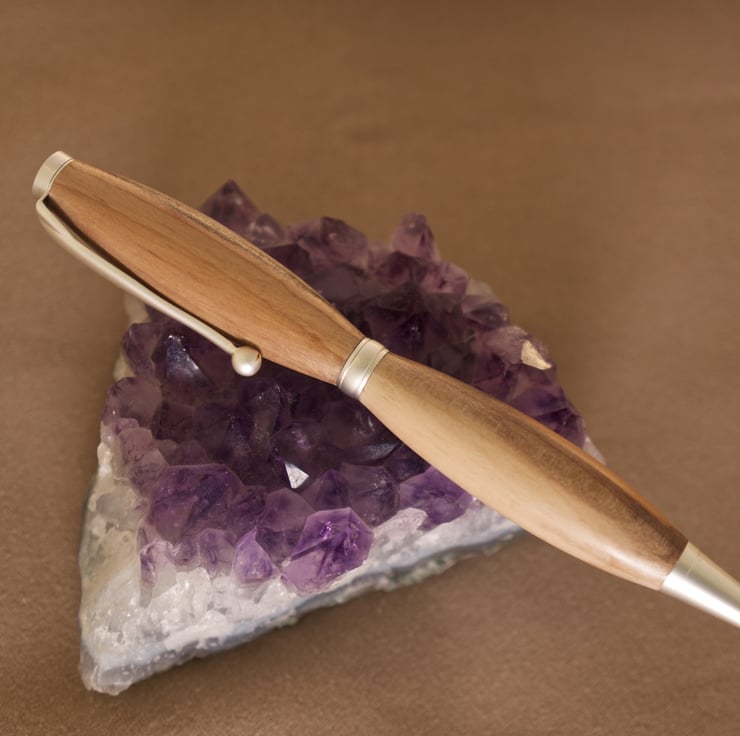 Hand crafted in my workshop overlooking the sea, the wood is finished with a very durable satin polish. The satin chrome tip, pocket clip, centre band and top finial compliment the colour of the wood, which changes from a rich red-brown through to a soft pale tan with lines of spalting through the grain. Spalting occurs when a fungus infects the wood of the living tree, then leaves dark lines through the wood when the fungus dies as the wood is dried. I have turned this pen so the barrels are at their widest at the centre, the slender shape of the pen making it very easy to hold.