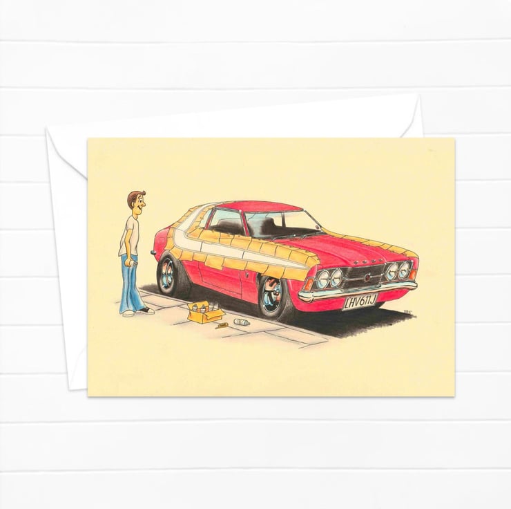 An original art greetings card featuring a popular car with typical seventies styling, undergoing a Starsky and Hutch style respray!