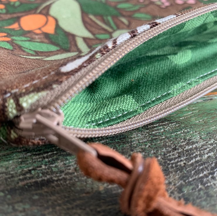 The pouch is lined with green Laura Ashley damask. It’s a great size for organising bits in your handbag, or maybe for keeping small craft projects and notions tidy.