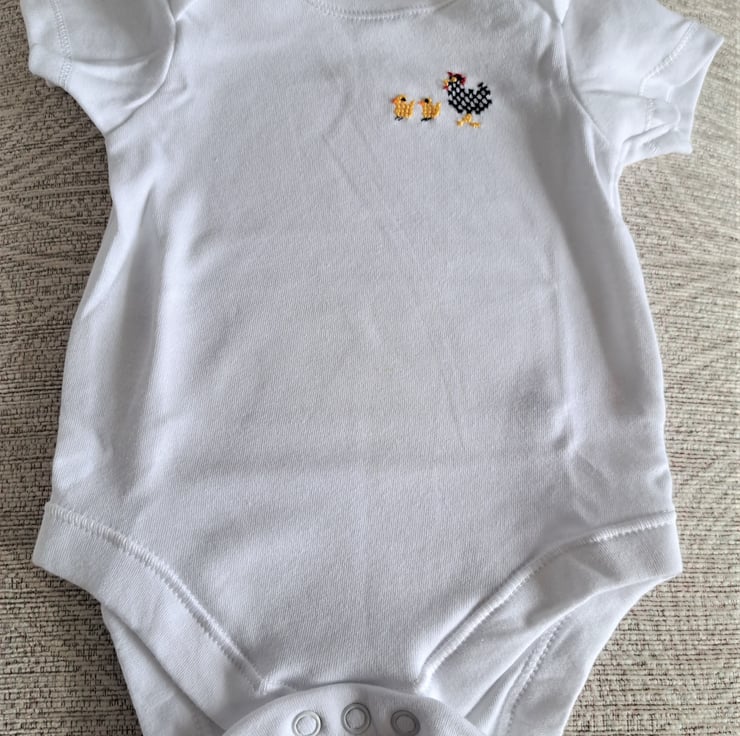 What a lovely gift for a baby! I have cross stitched a black and white speckled hen and her two yellow chicks on the left front of a white baby vest/onesie. As I never use a permanent backing material when hand embroidering kids' clothing, there is nothing inside this garment to irritate your baby's skin. The vest has an envelope neck, short sleeves and three press studs between the leg openings. It is 100% cotton and can be machine washed.