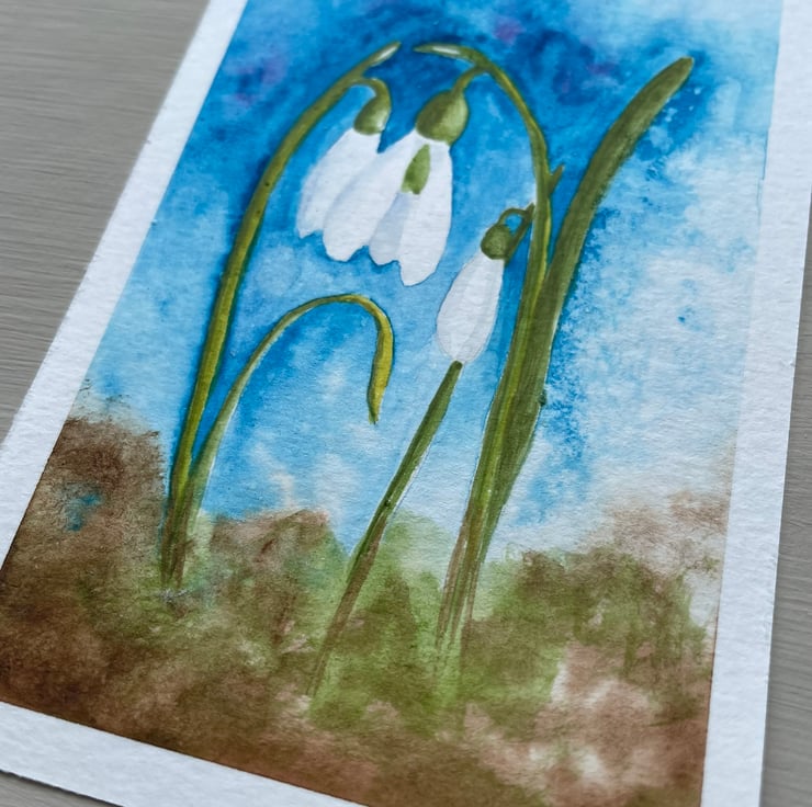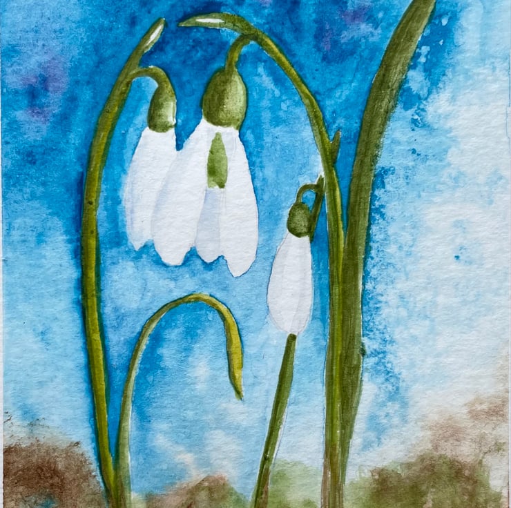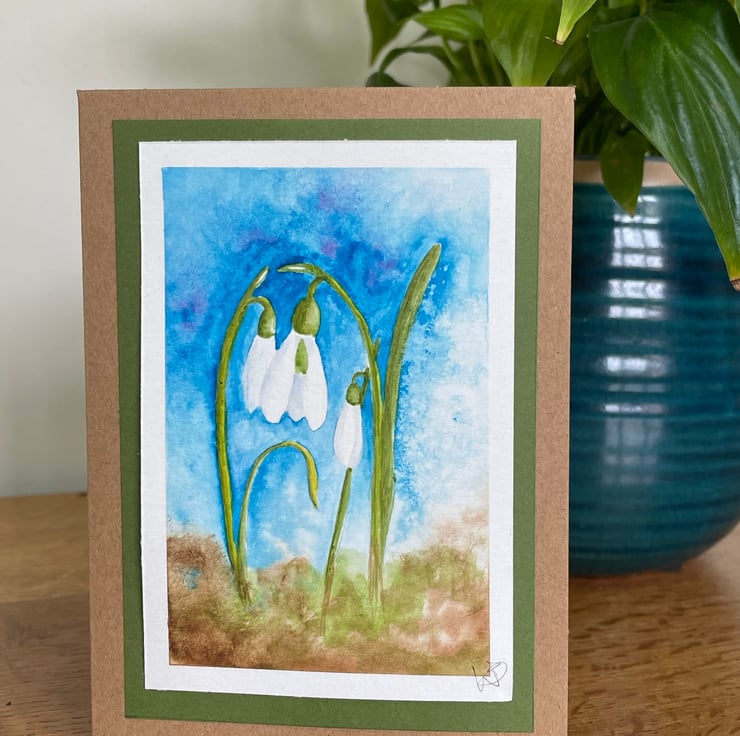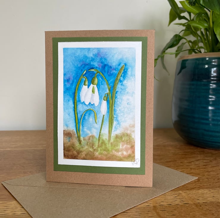 This blank greeting card features hand painted snowdrop flowers, heads nodding in the ground with a bright blue background to show off their whiteness, the painting is then mounted onto an olive green background card prior to mounting on a recycled brown craft card, it is left blank for any occasion from a birthday to a thank you note but could also be framed and put up on a wall.