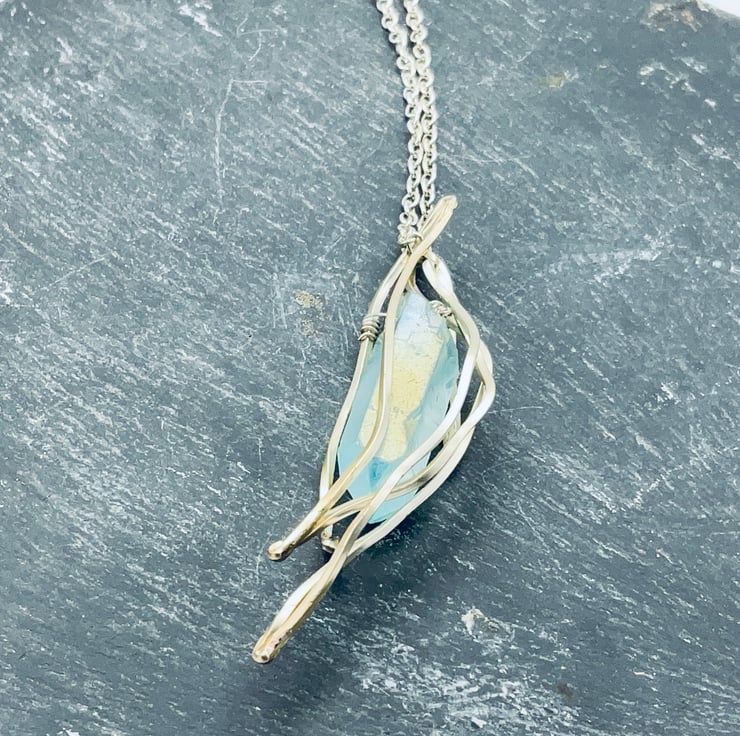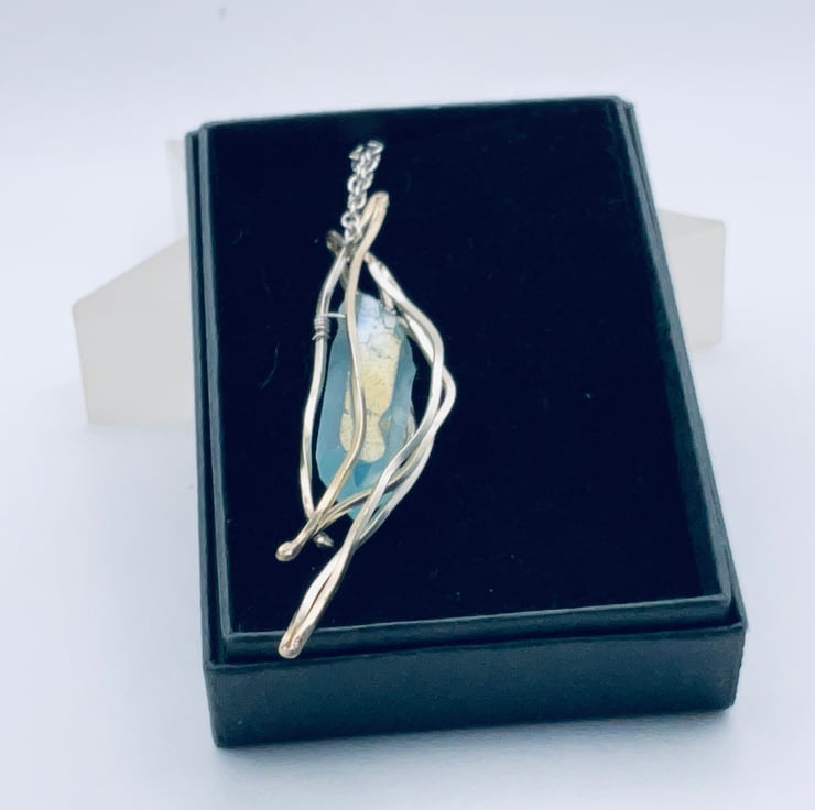 Square shaped silver wire is bent in different directions to look like a lightening flash. It also contains an agate crystal point in aqua colour..