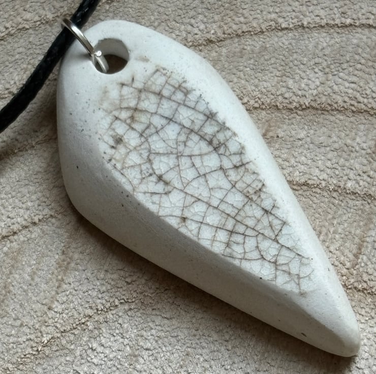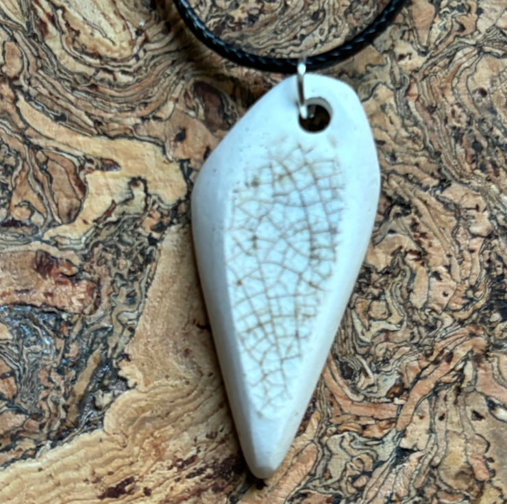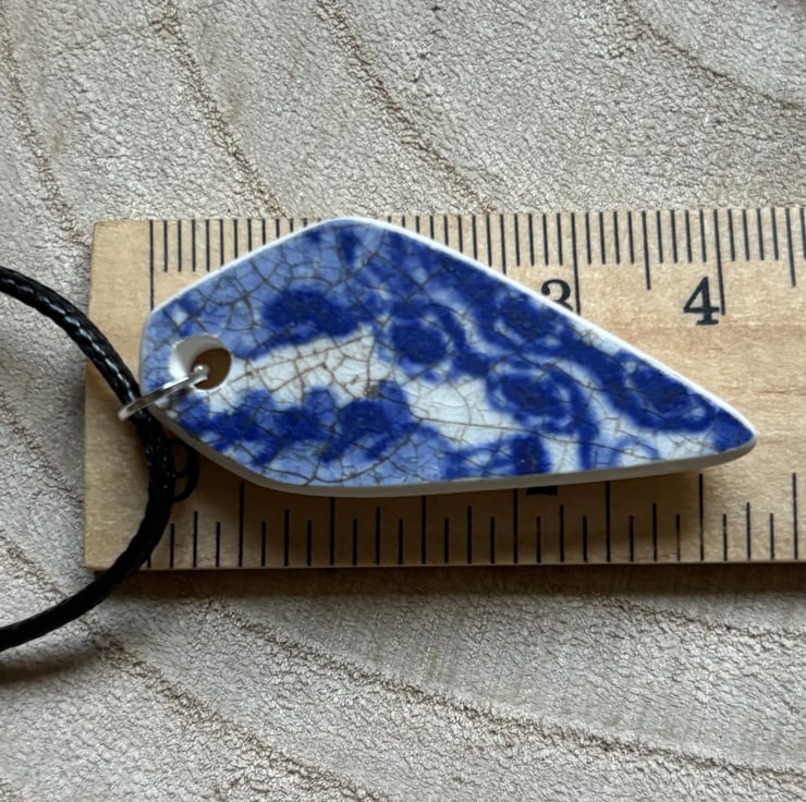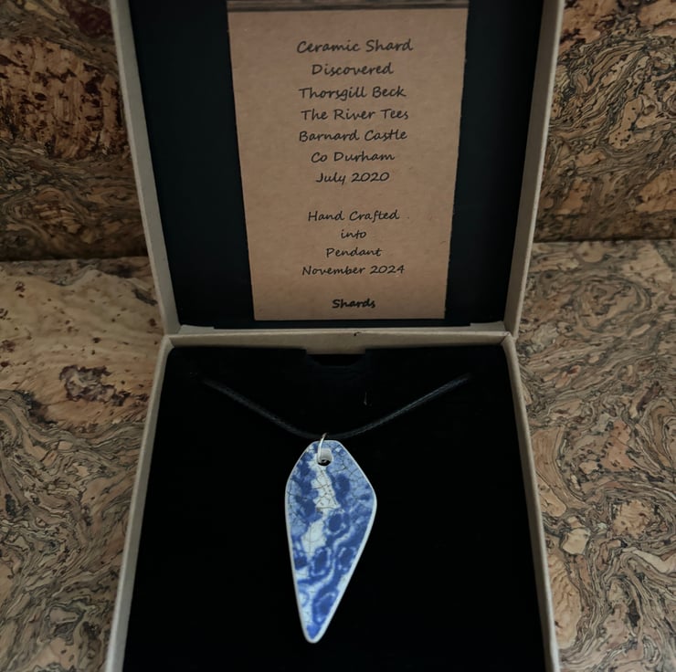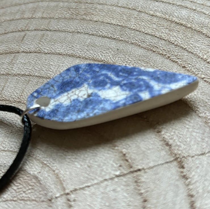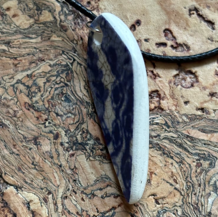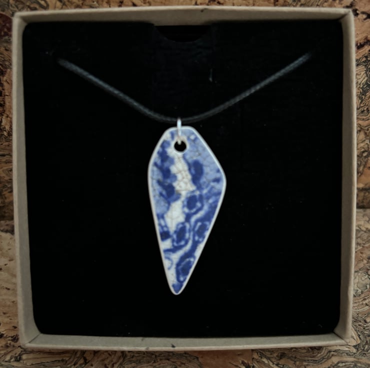 I noticed an unusual shaped shard, white with crackle glaze laying in the stream. When I picked it up I discovered a lovely blue and white pattern. After a thorough clean I managed to drill a hole, sand the sides and back to create this pendant.