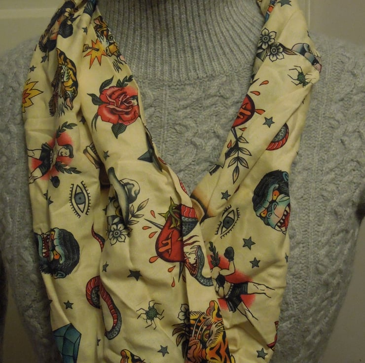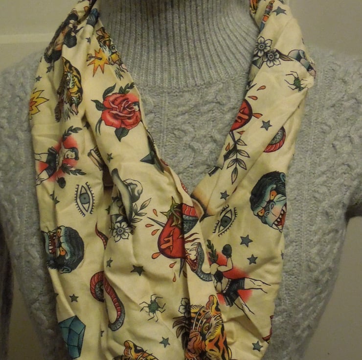 Lovely fun print, from Alexander Henry fabrics, twist scarf. Easy to wear and goes with casual or rock!