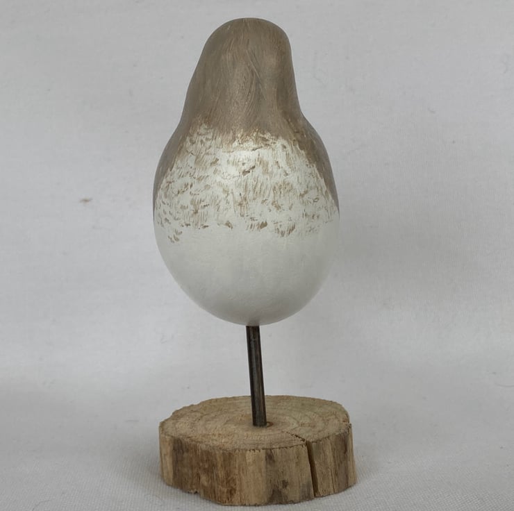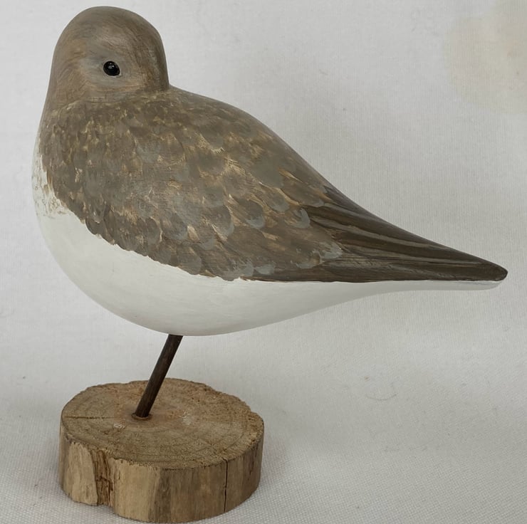This little dunlin is hand carved from jelutong and painted with several layers of acrylic paint to build up the colour. It has hand coloured glass eyes and is finished to a soft shine with wax. it is mounted on a section of driftwood and is 13cm tall, 6cm wide and 13cm long. It does not have feather perfect detail as my aim is just to catch the character of each bird.