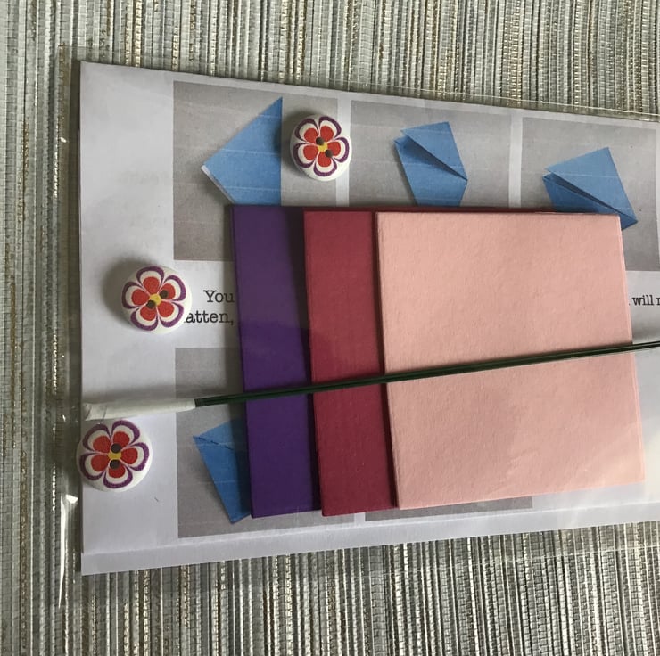 Provided are three buttons, three 18cm long florist wires and 18 squares of paper. This will enable you to create three paper flowers, each have 5 petals, giving you extra 3 squares for practising.