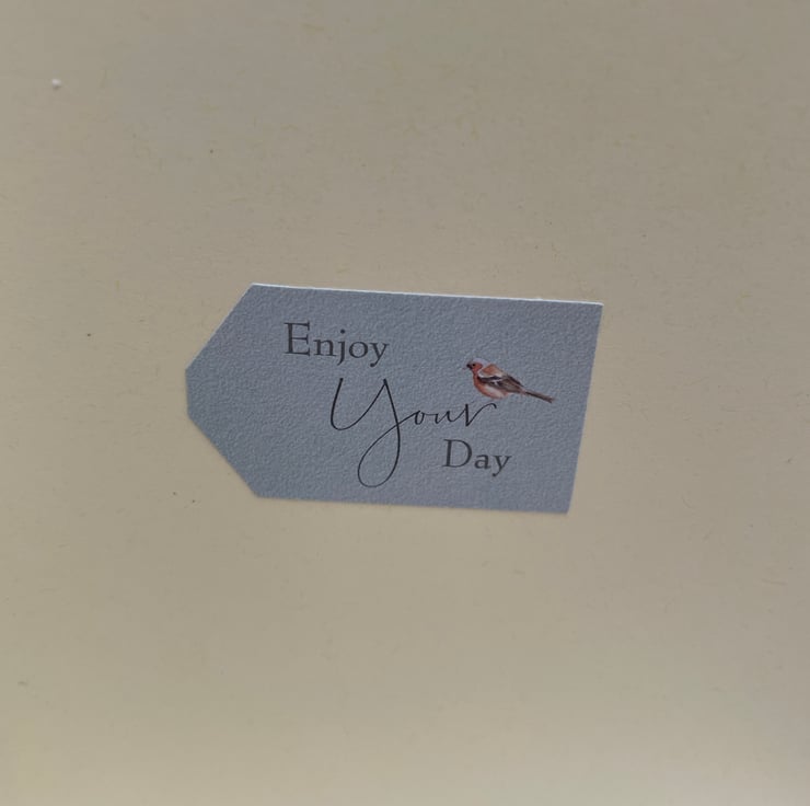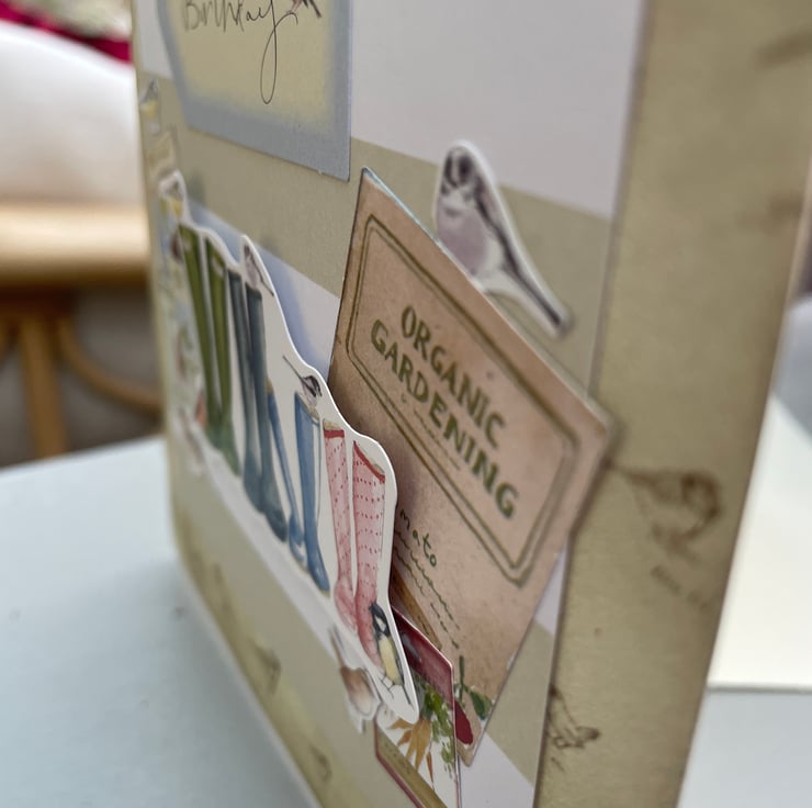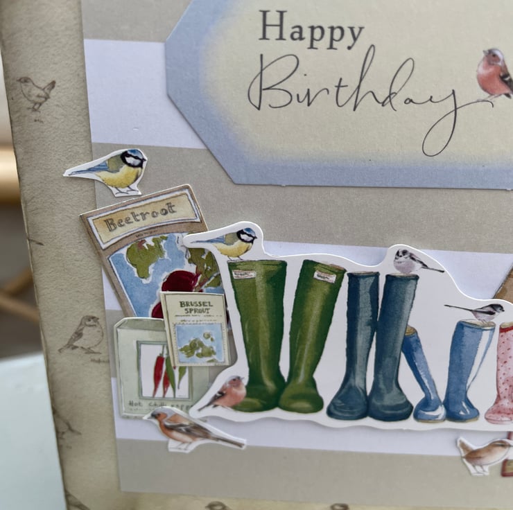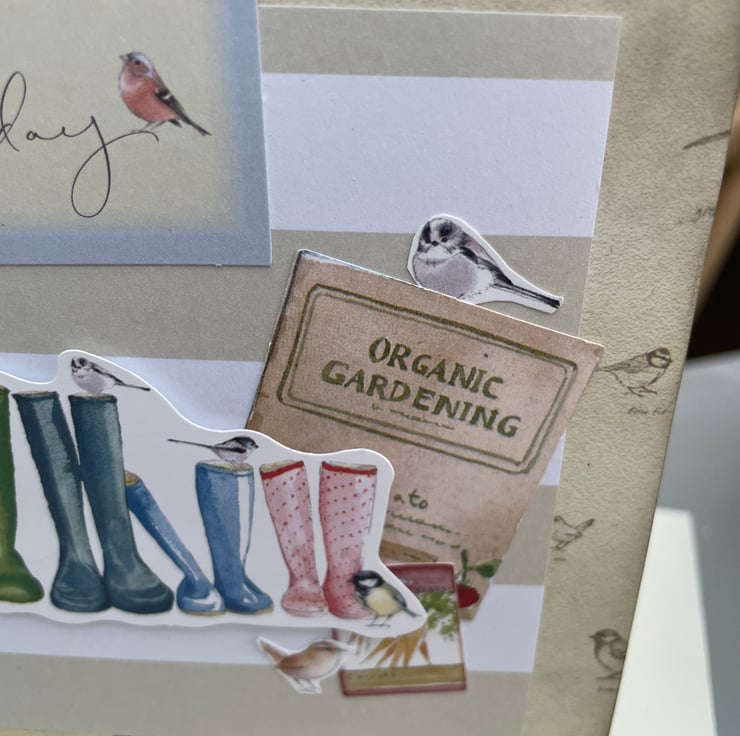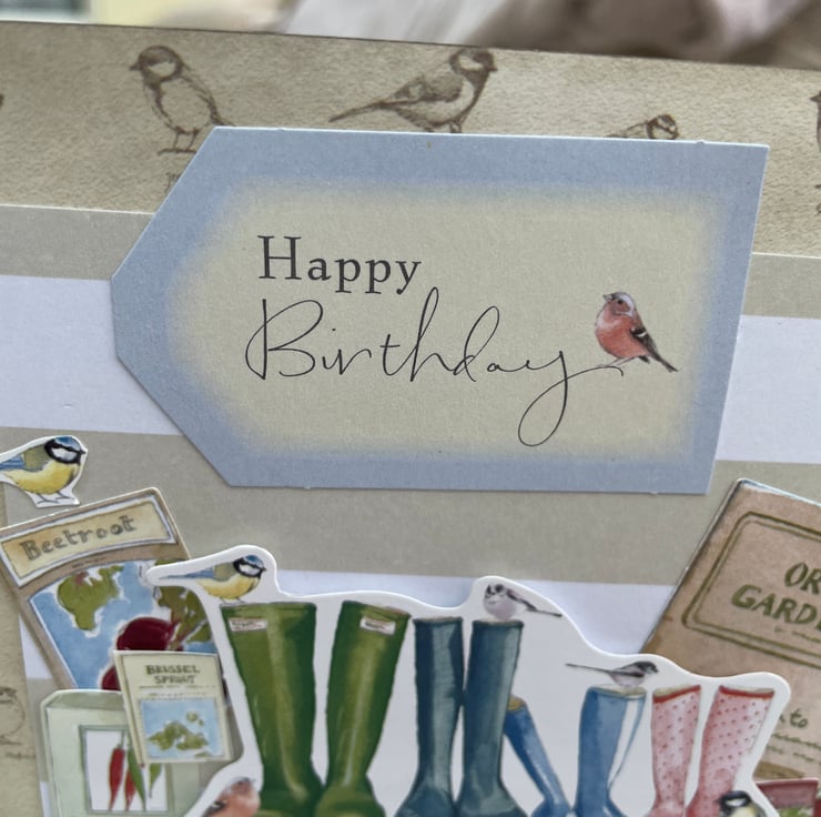 Get your wellies on and garden. This cute 13.5x13.5cm card features a family set of wellies. The backing paper is a cream colour and has sketched birds all over it. This is topped with a matching striped paper. This is embellished with seed packets, birds and the family set of wellies in various colours. The greeting is Happy Birthday on a pale blue tag. Inside the card had a matching tag that says Enjoy your day.