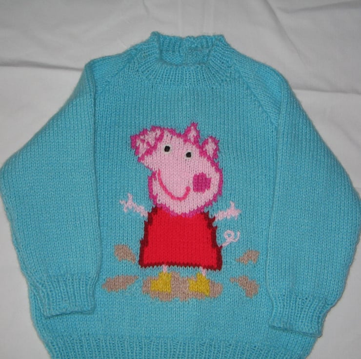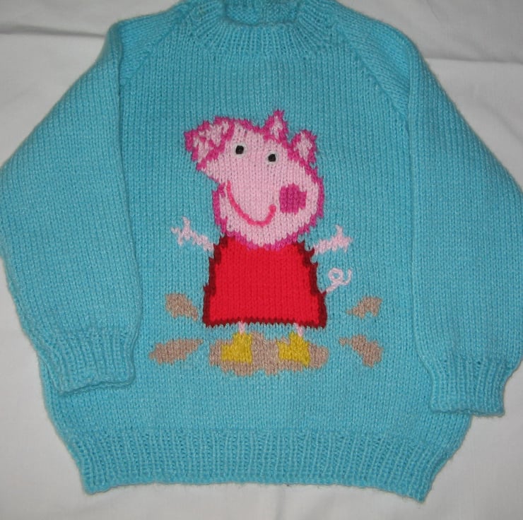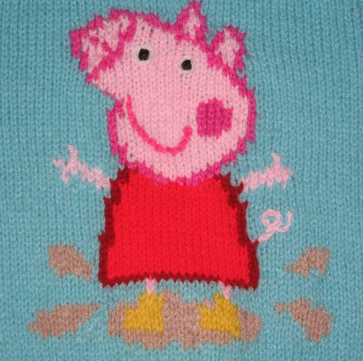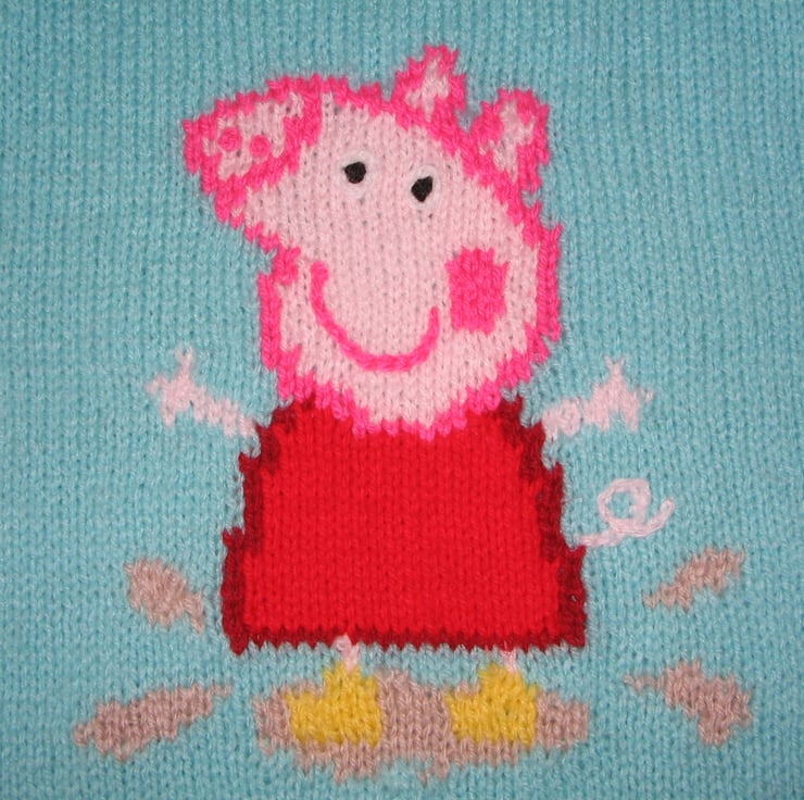This is an adorable Peppa Pig sweater hand knitted in 100% acrylic for easy washing. It shows Peppa wearing her yellow boots and jumping in puddles, her favourite past time. Sure to delight Peppa pig fans!