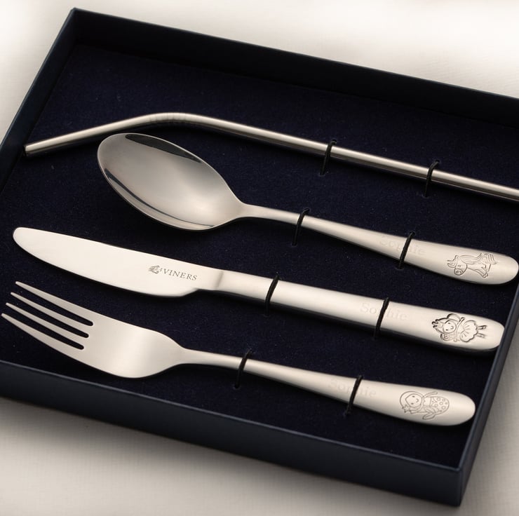 Includes 1 dinner knife, fork, dessert spoon and stainless steel straw.