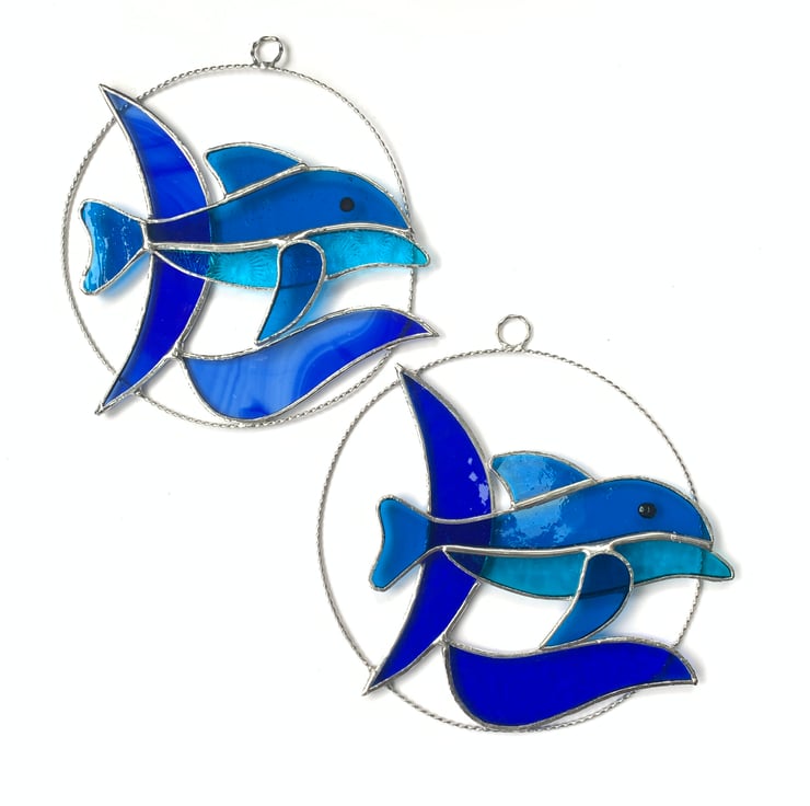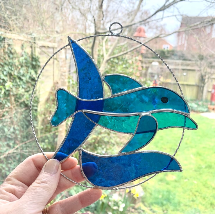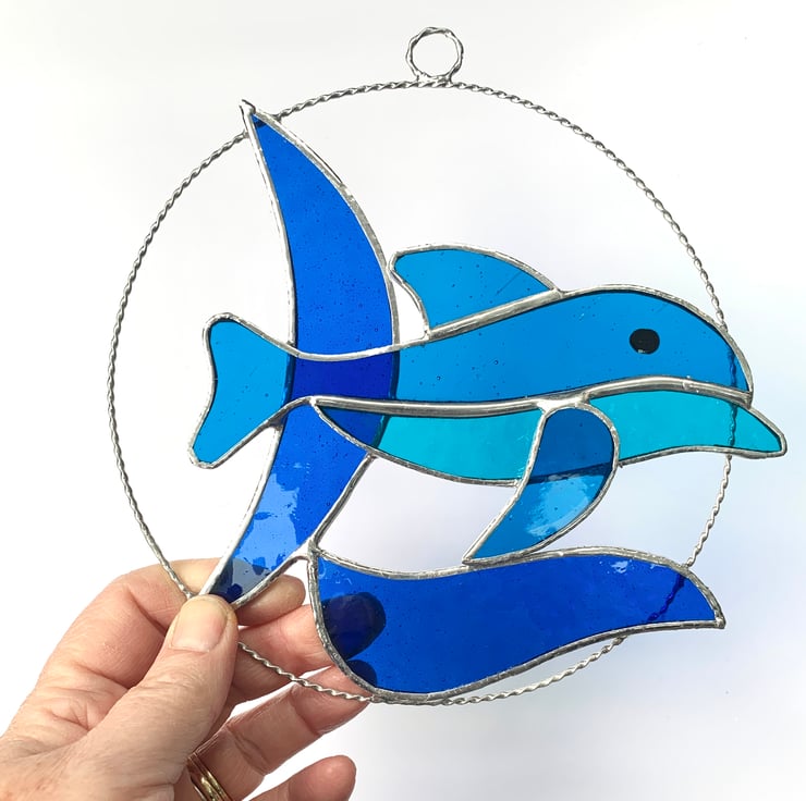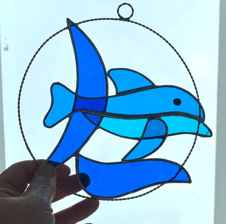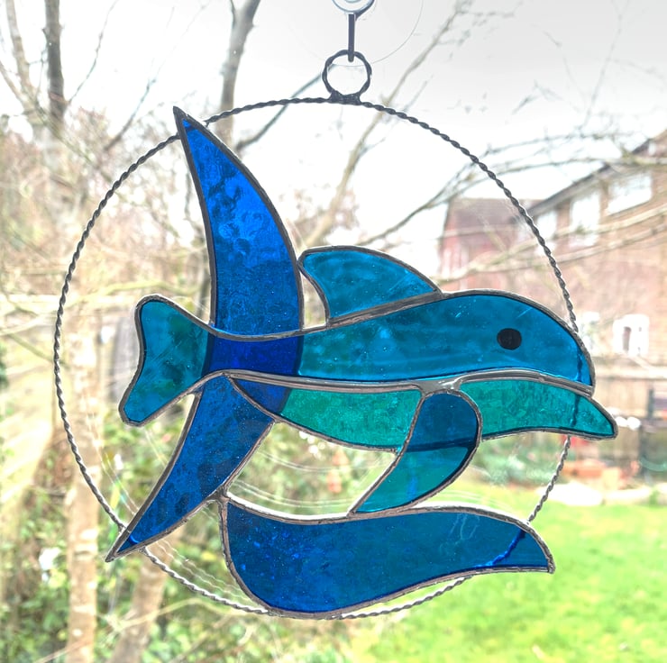 Each piece of glass has been cut by hand, ground and washed, foiled and soldered together before being washed again and polished. The dolphin and waves have been attached to a ring of twisted inner wire and the dolphins eye is glass paint.