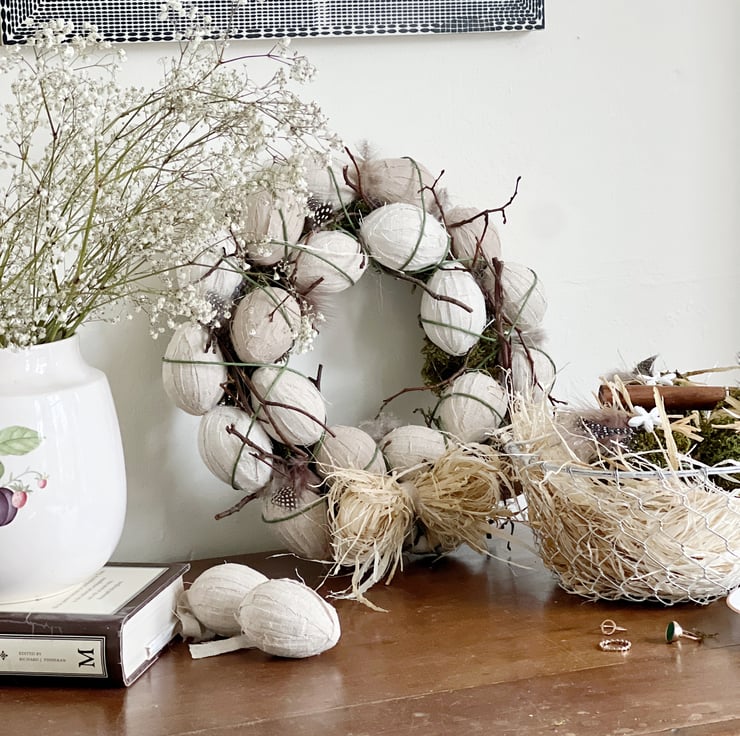 This wreath is adorned with eggs that I wrapped in strips of varying shades of natural linen. I then gathered a few simple, yet stunning materials like moss, branches and feathers; to combined with these linen eggs to transform this wreath into an understated, plucked-from-nature display. They'll enhance your home, not just for Easter, but all year long!