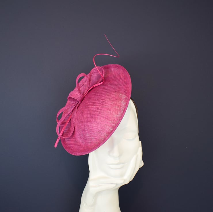 Shown here in a cerise pink shade, it can be also be tailor made to your outfit. The elegant minimalist style of this hat means it will compliment both simple, tailored fashion as well as heavily patterned prints.
