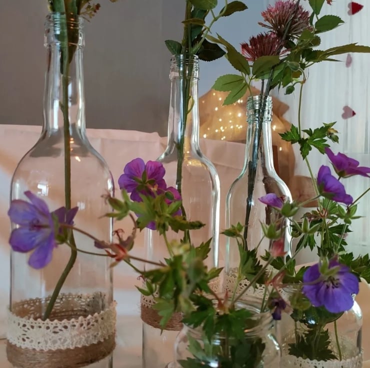 This is a set of 2 bottles and 3 jars ideal for a rustic vintage wedding all items are hand decorated