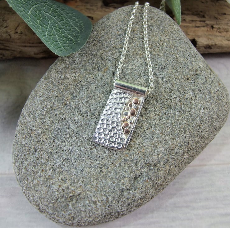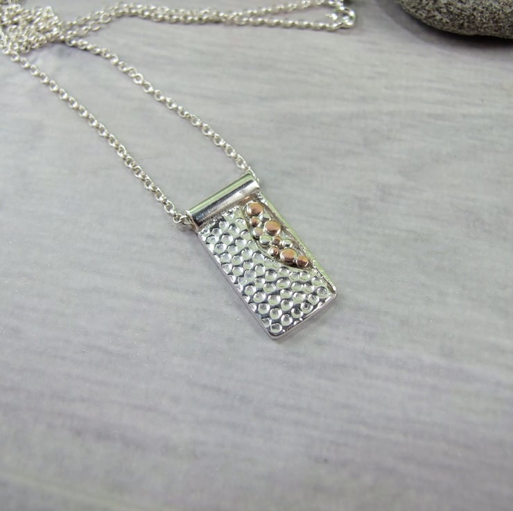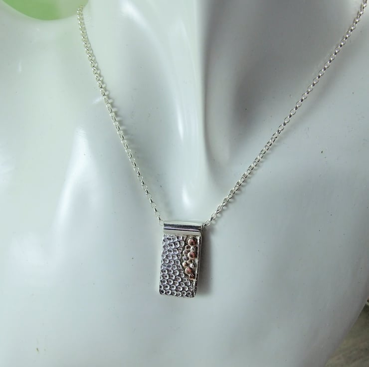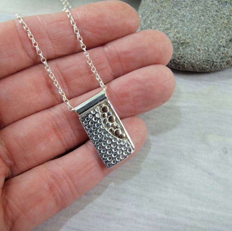 The small rectangle has been cut from silver sheet and textured with a spotty pattern, part of the sheet has been cut away in an abstract design and in the space I have added lots of tiny individual copper and silver beads like little bubbles. Fitted to a 20 inch sterling silver chain.