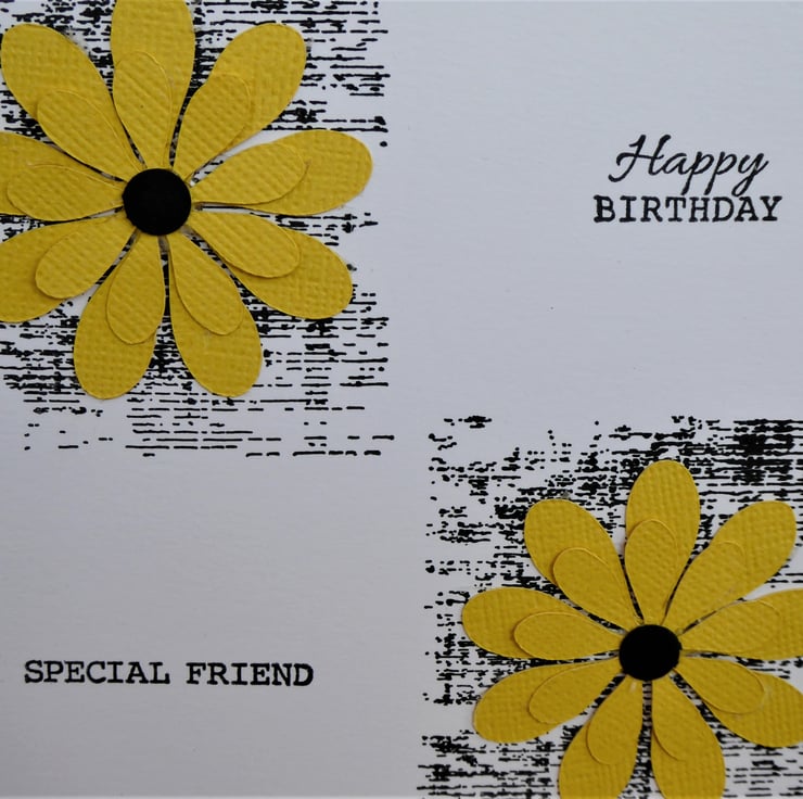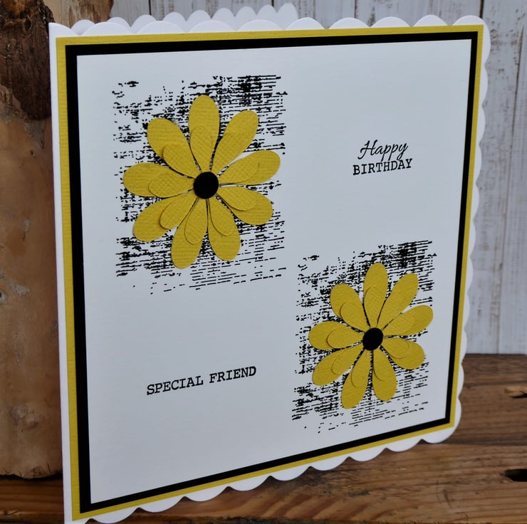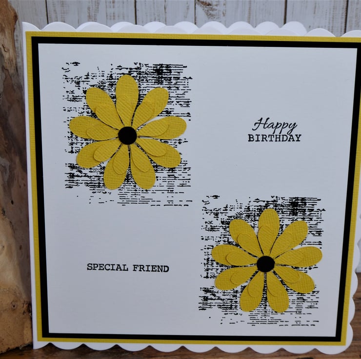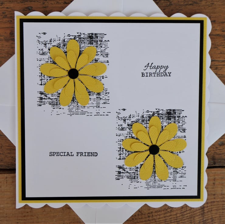 This lovely birthday card is just right for that special friend. Made from 300gsm white scalloped card, I have stamped out background and sentiment and added electronically cut flowers and layered up onto yellow and black card.