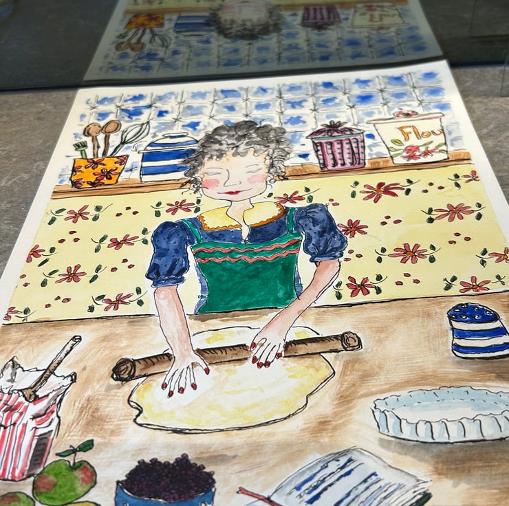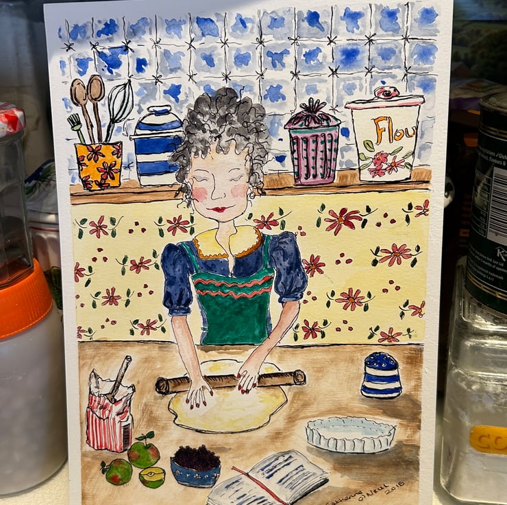 This is an original ink and water colour painting. Named so as that is my favourite time to do a spot of baking. The pottery drawn in this painting is based on a container which was my Granny’s.