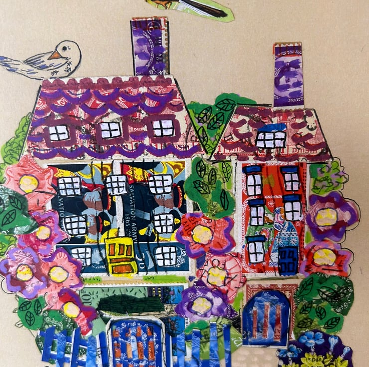 The inspiration for this picture started with a box of vintage postage stamps that I have purchased. I hadn’t a clue what I was going to do with all these stamps at the time. But once i started playing around with them I thought they would make cute little houses.