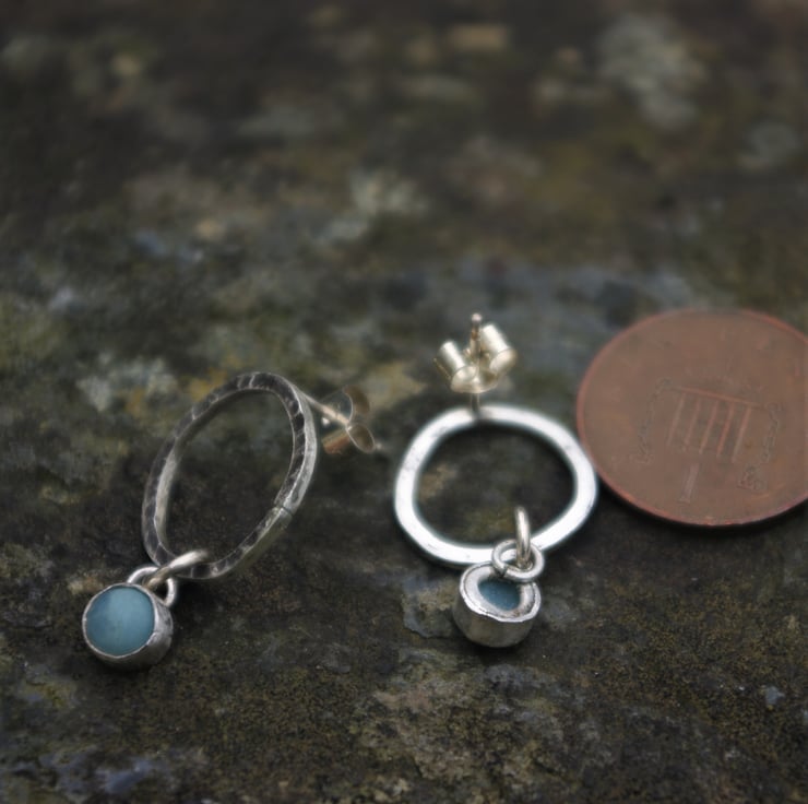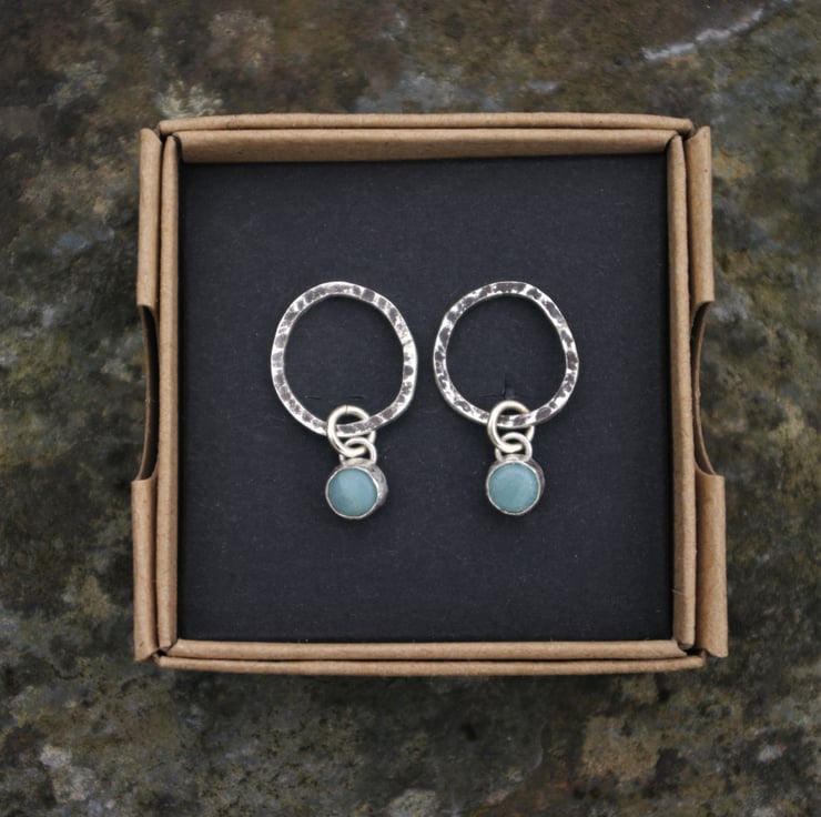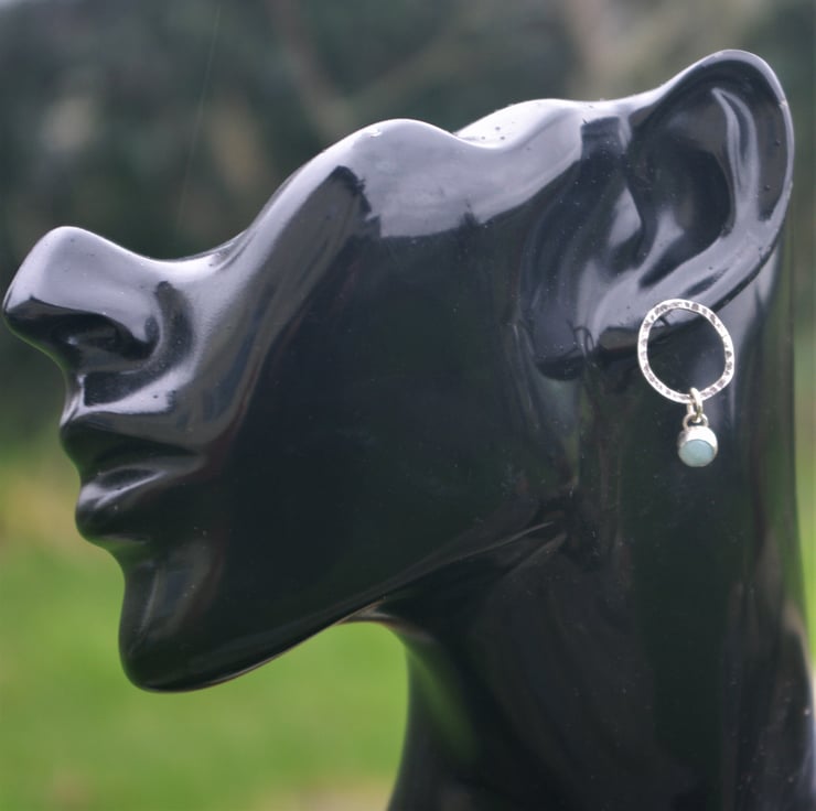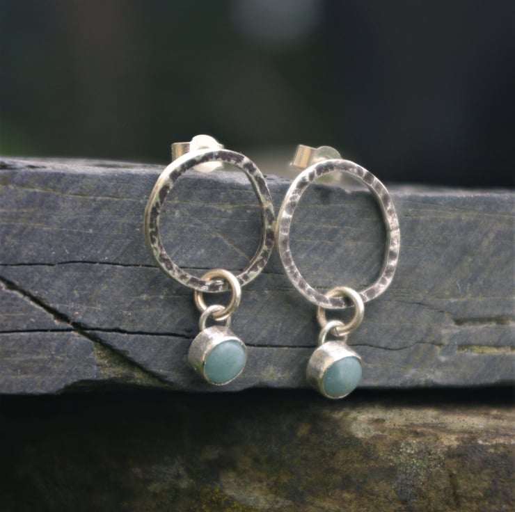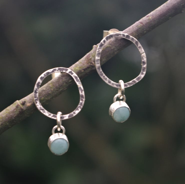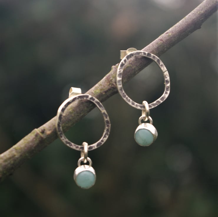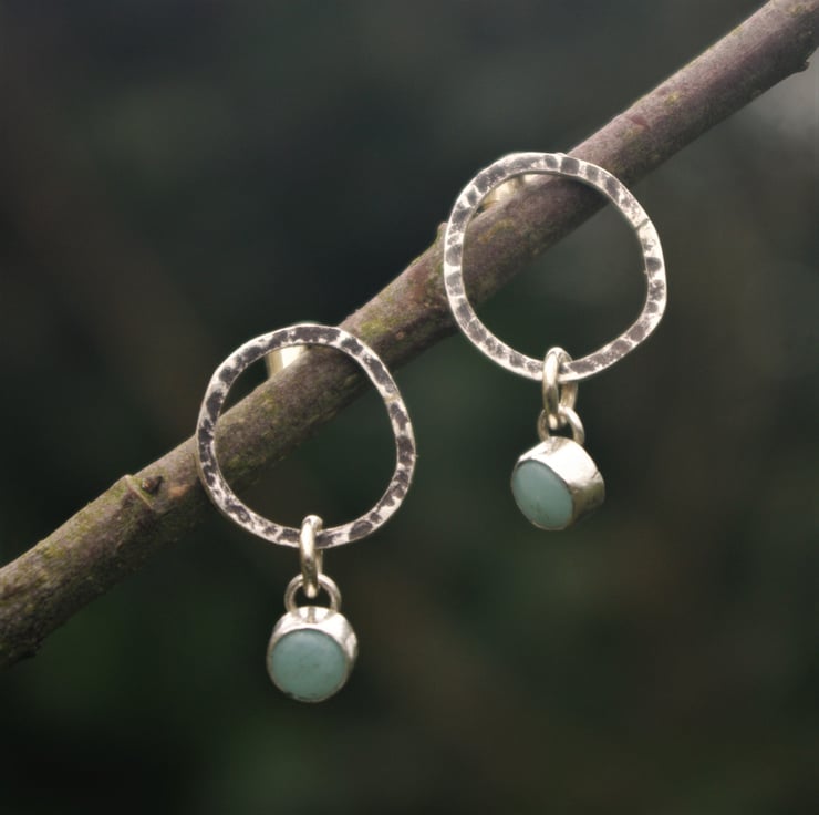 Amazonite cabochons which are hand set in silver, dangle from the bottom and move about freely.