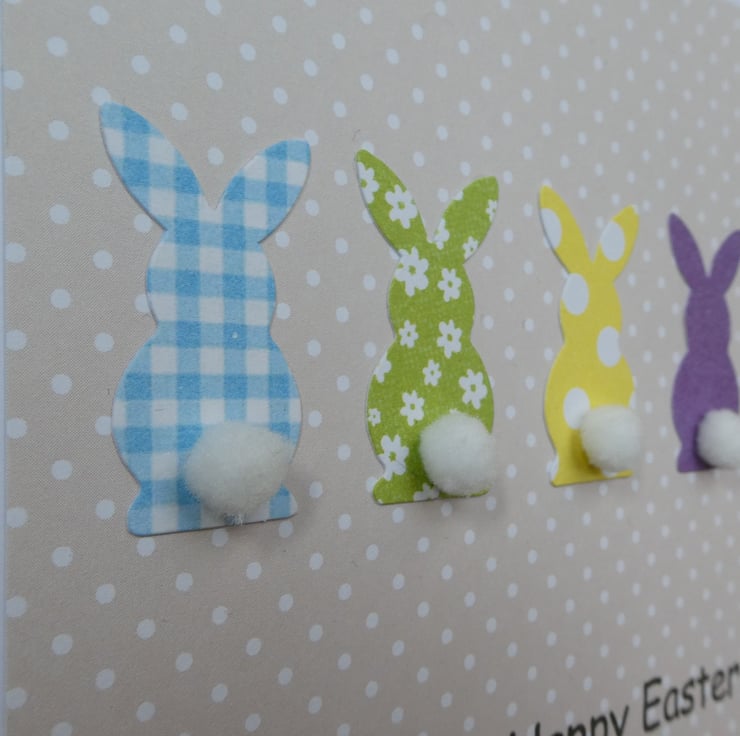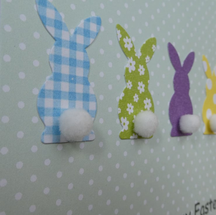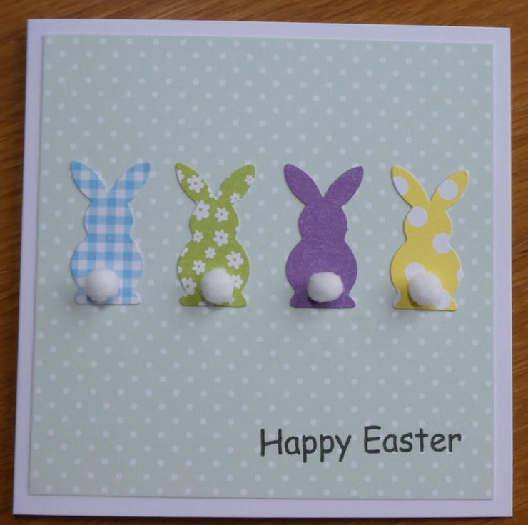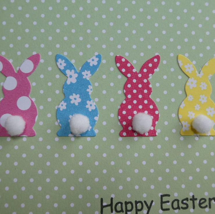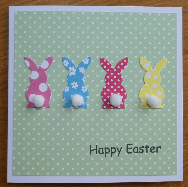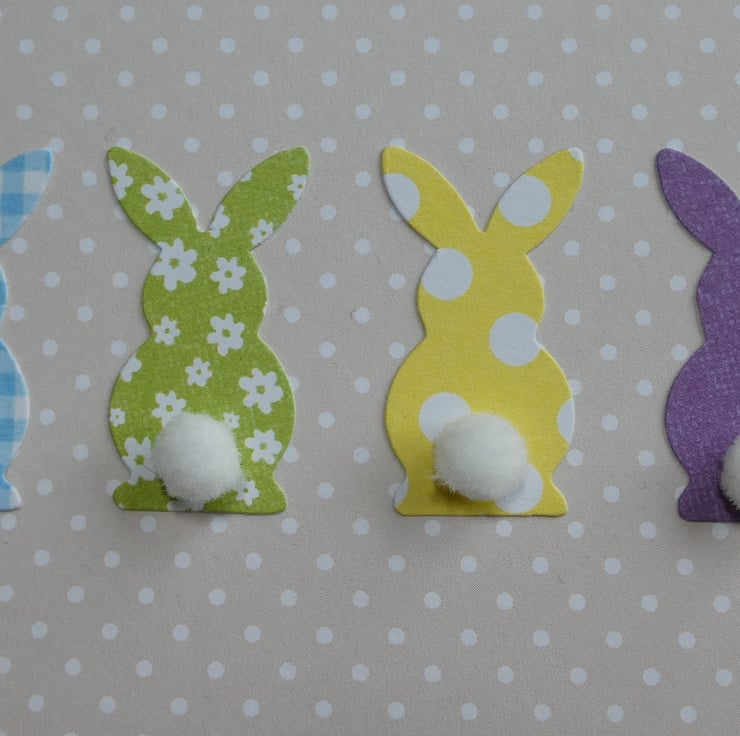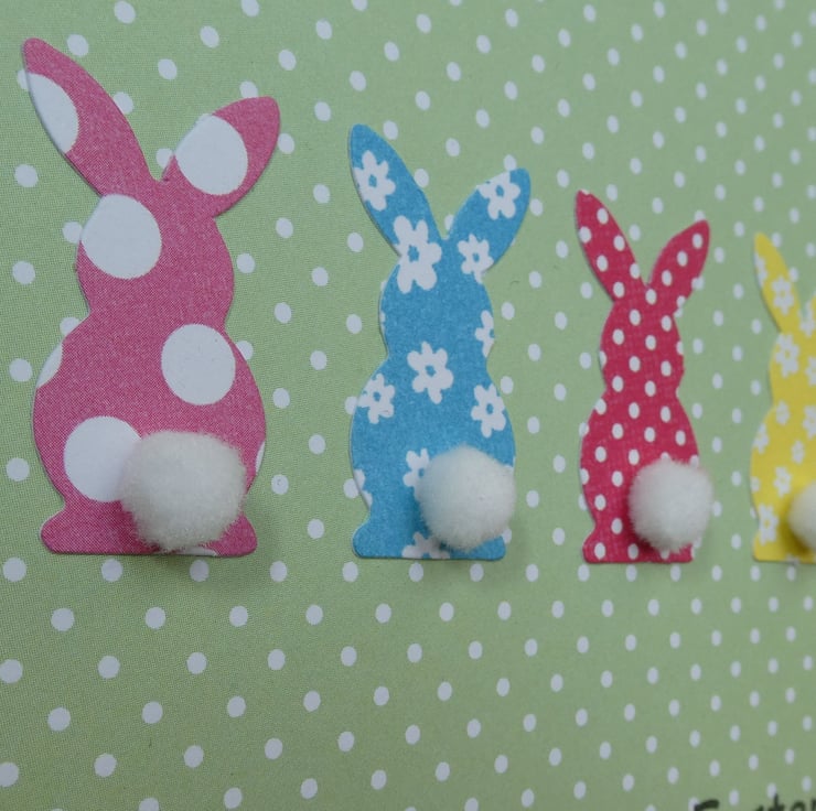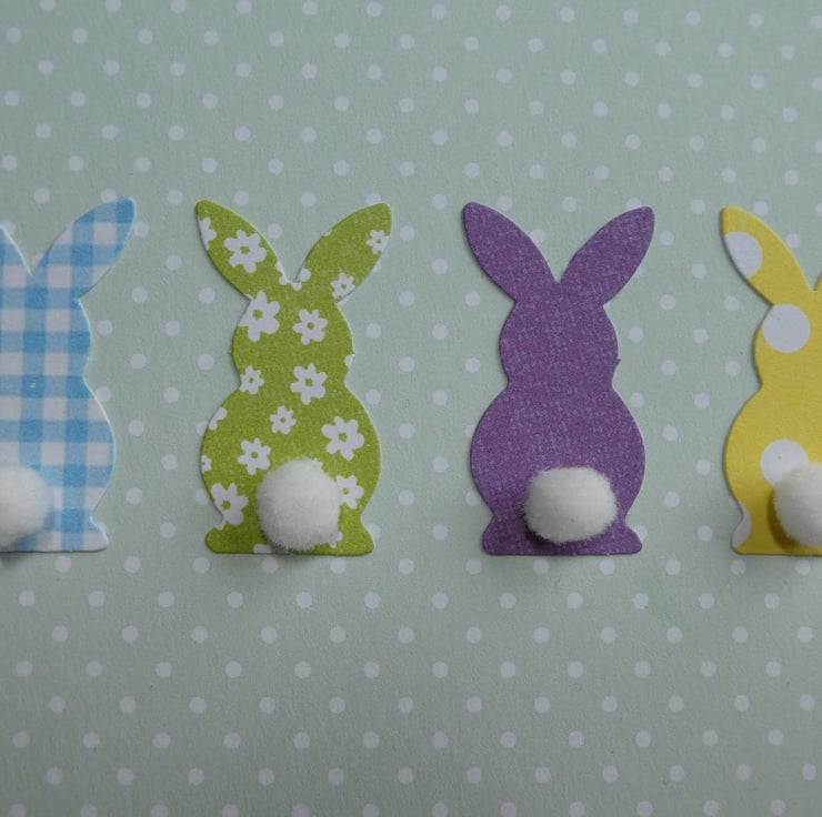 Each card has a square of polka dot card with a row of 4 mini bunnies die cut from patterned card all with tiny white fluffy pom pom tails.