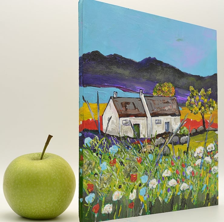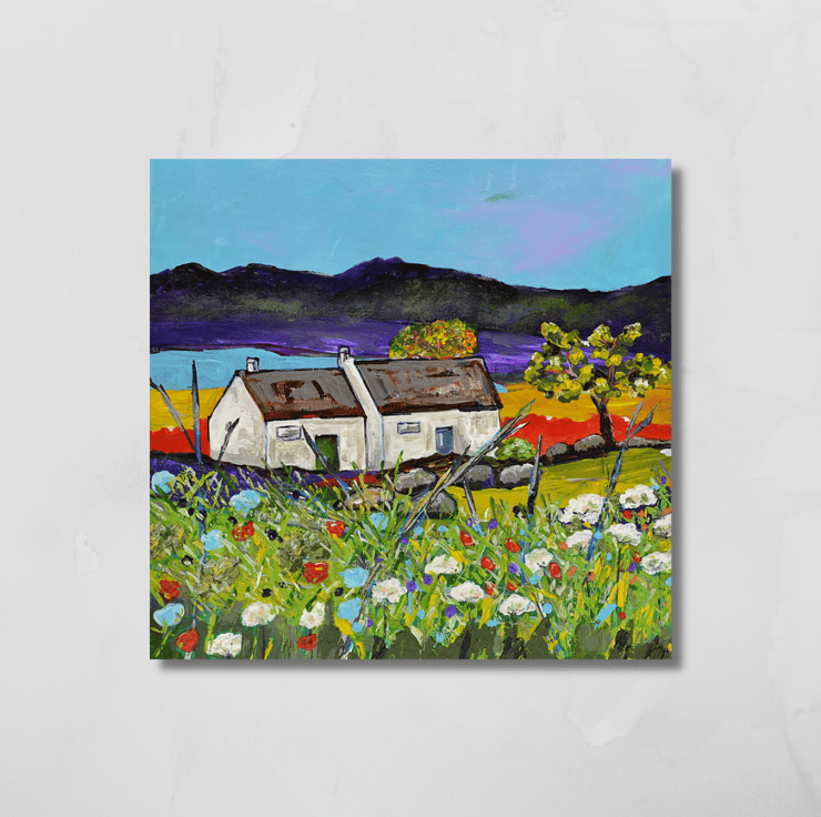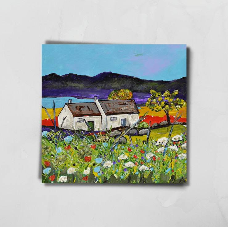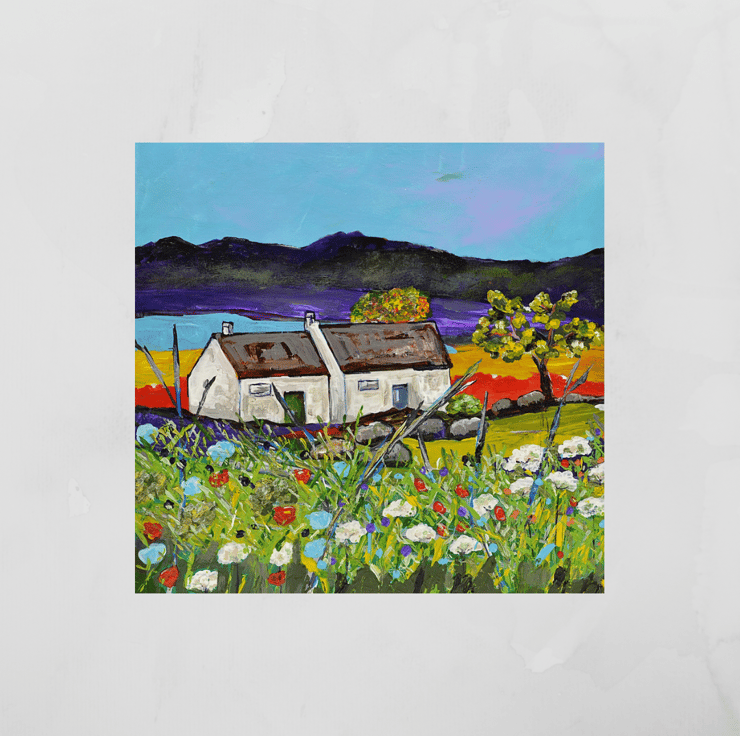 (053) This acrylic painting is called, "Neighbours". In an area that looks like there is a lot of space, two crofts are nestled tightly together. This painting was inspired by trips to Sutherland in the north of Scotland. The painting would make an ideal gift for any occasion.