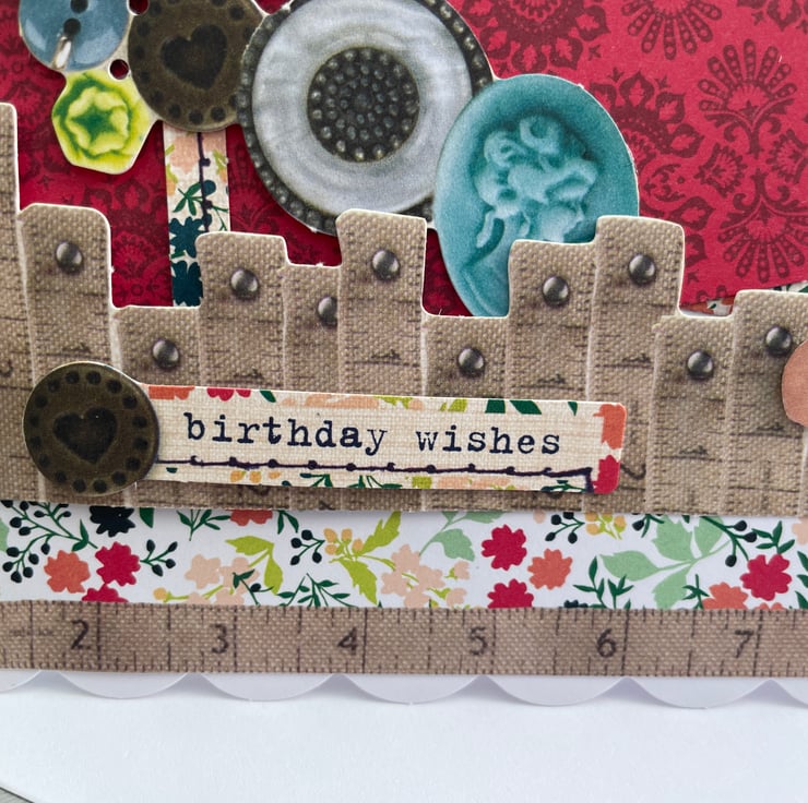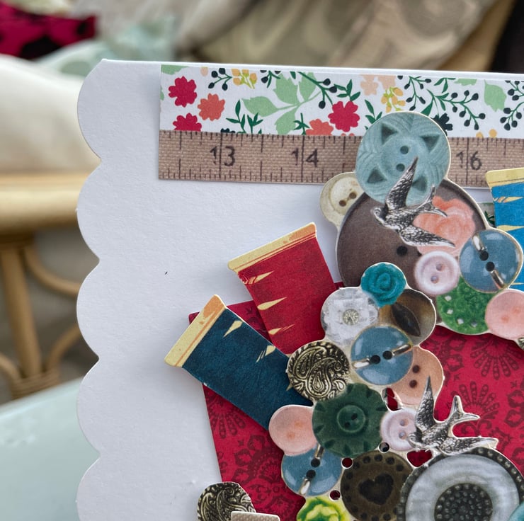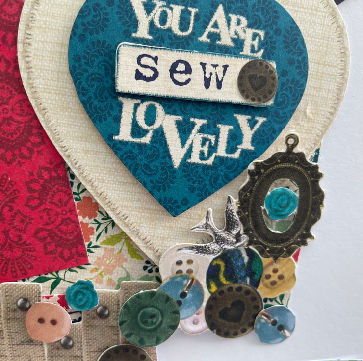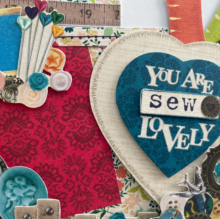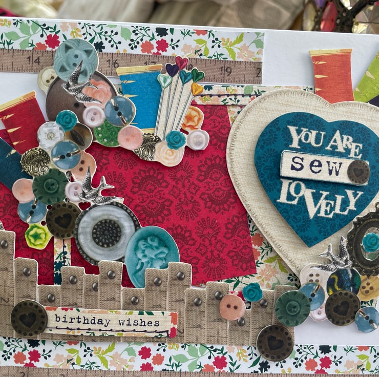 A sewing ephemera birthday card. An unusual A5 sized layered card full of sewing bits and pieces. The card is layered with buttons, pins, cotton reels and tape measures. A large heart says You are sew lovely and there is a happy birthday greeting. All ephemera is paper but looks like the real thing. Inside the card is blank for your own message.